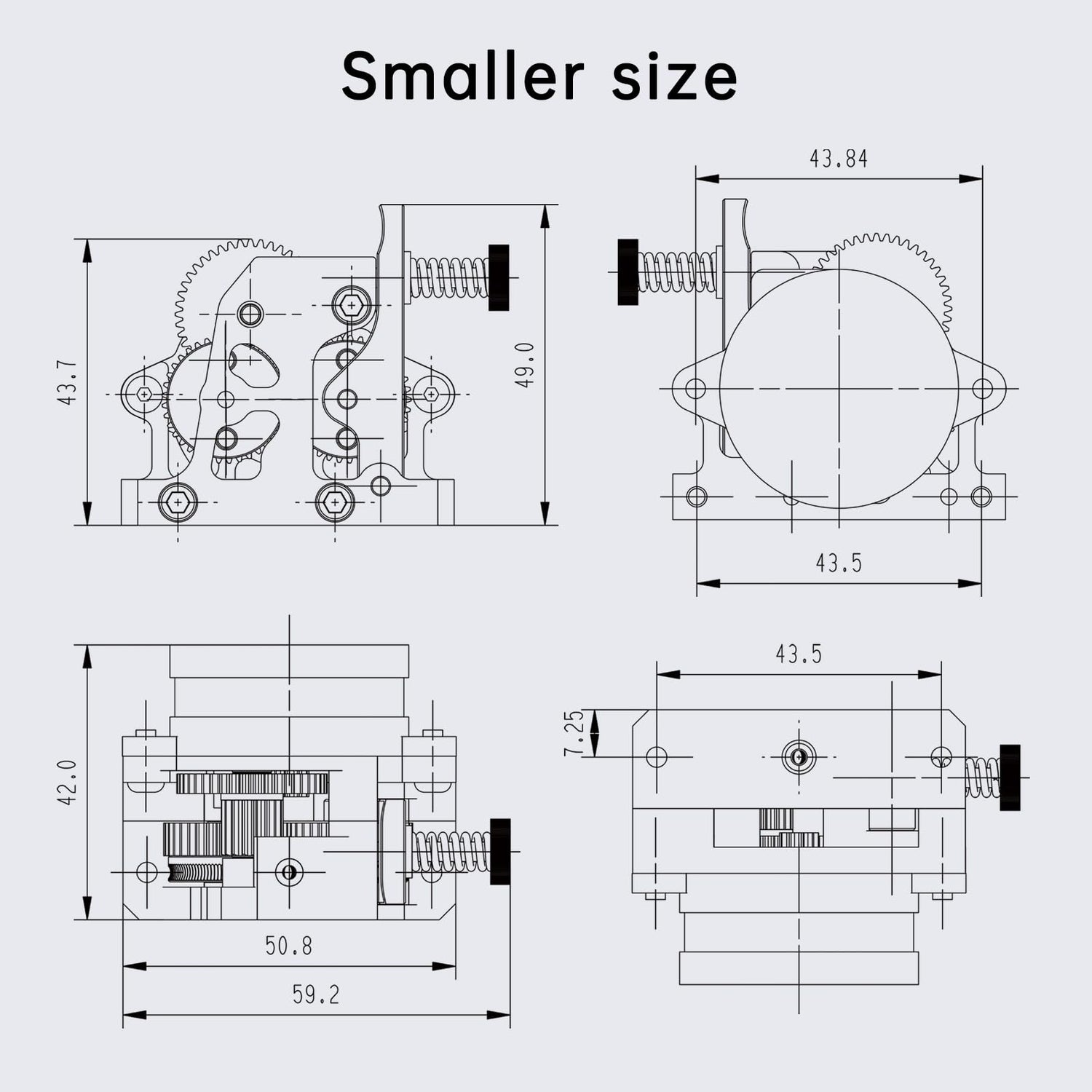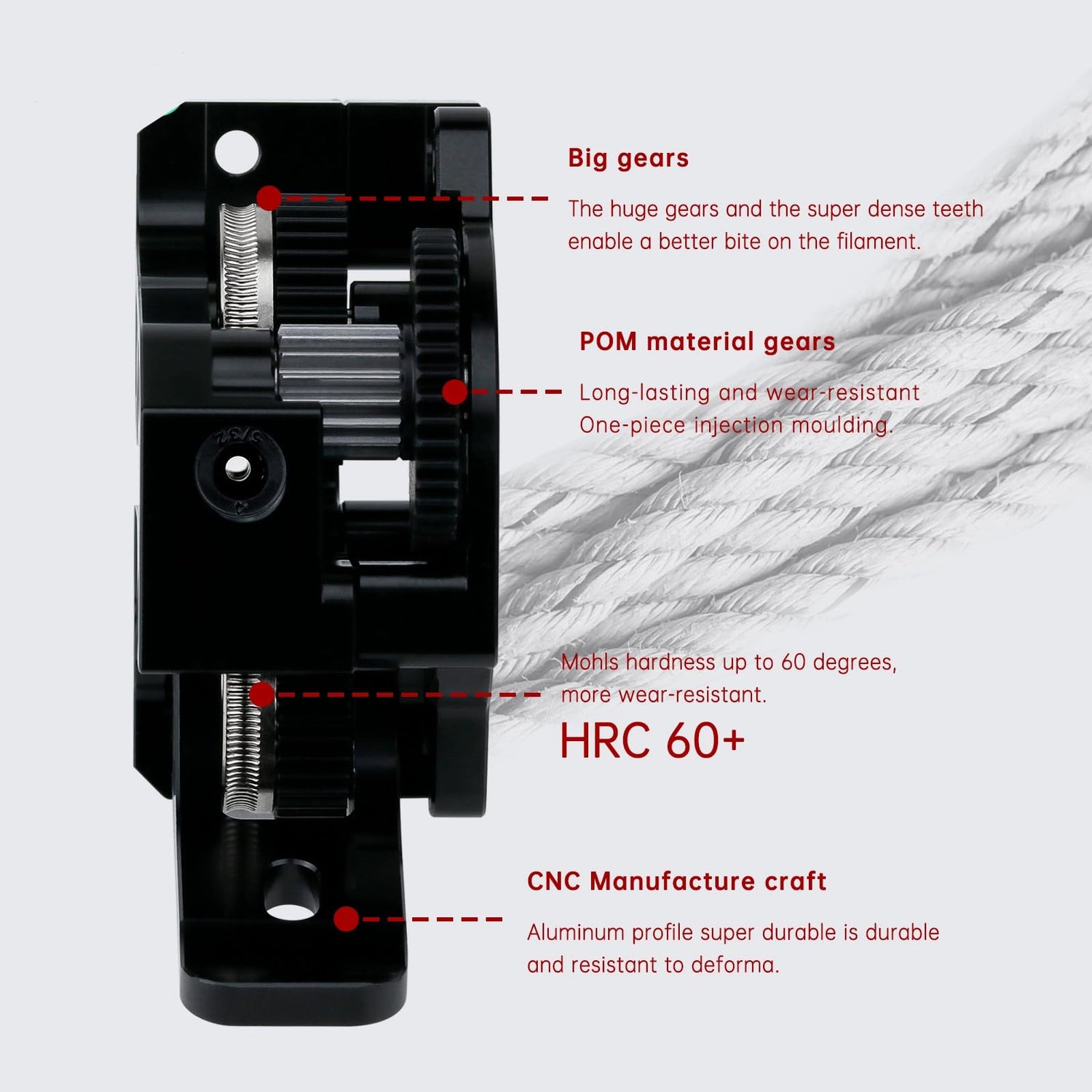 - The lighter weight and smaller volume of the extruder enable it to obtain larger transmission ratios and torques. The outer shell is made of all aluminum alloy with oxidation treatment, and the reduction gear is CNC machined with POM, which is wear-resistant and has a longer lifespan