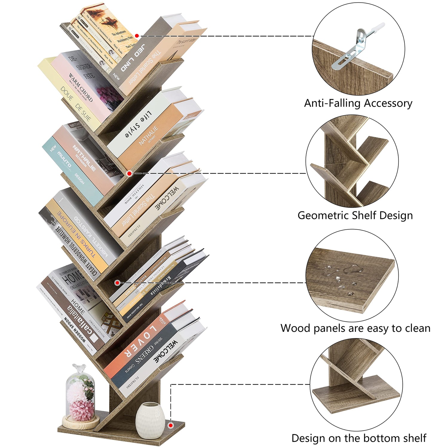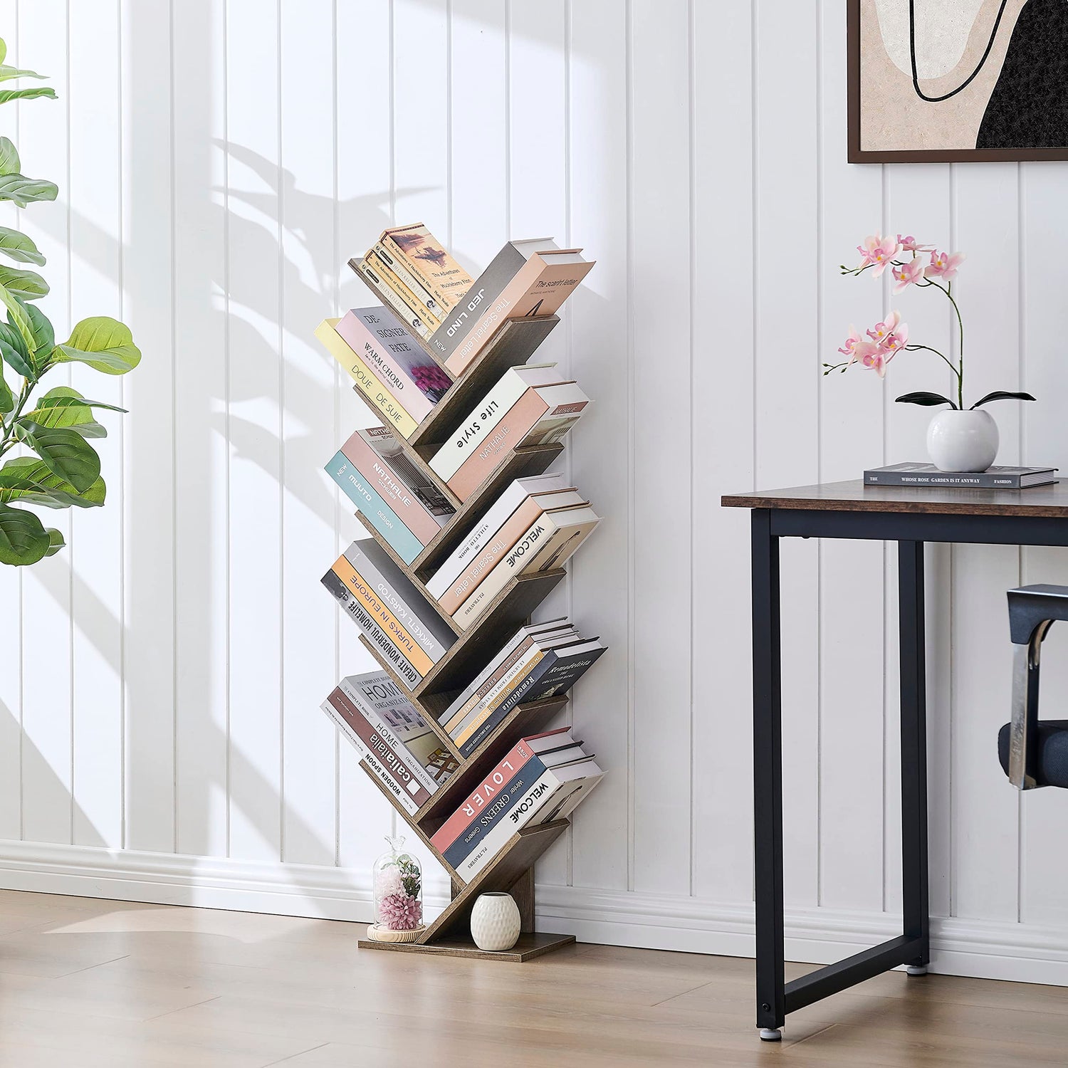 - 【Space Saving & Large Capacity】 This bookshelf is very compact with 10 open shelves, ideal for storing books, potted plants, CDs, magazines, videos, photo albums, crafts, or other favorite collections. This tree-shaped bookshelf takes up very little floor space. It is the ideal bookshelf for corners and small spaces.