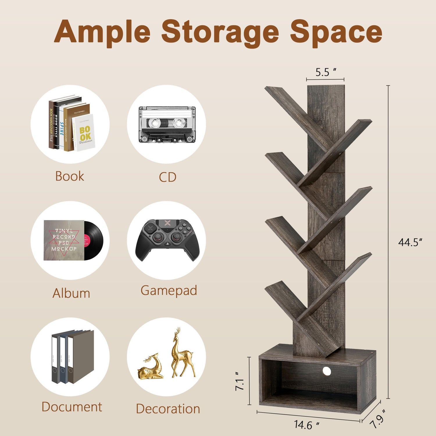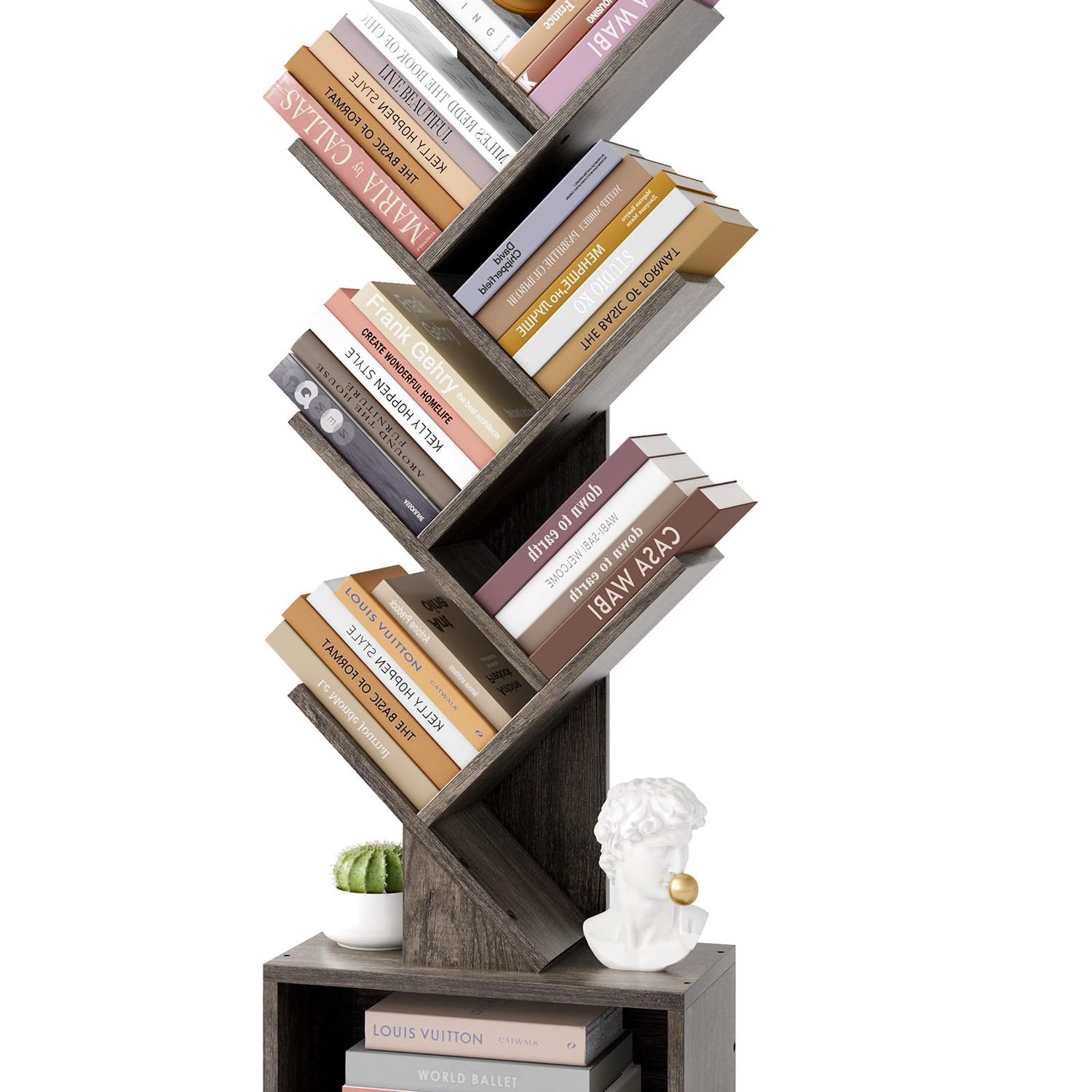 - [Space Saving and Ample Storage Capacity] Our 6-tier tree bookshelf offers 6 open shelves and a large drawer for storage. Whether it's books, decorations, CDs, magazines, video games, manga, novels, speakers, potted plants, photo albums, crafts, or other collections, you can easily organize them on this bookcase. With its narrow design, it can be moved easily to any corner or small space.