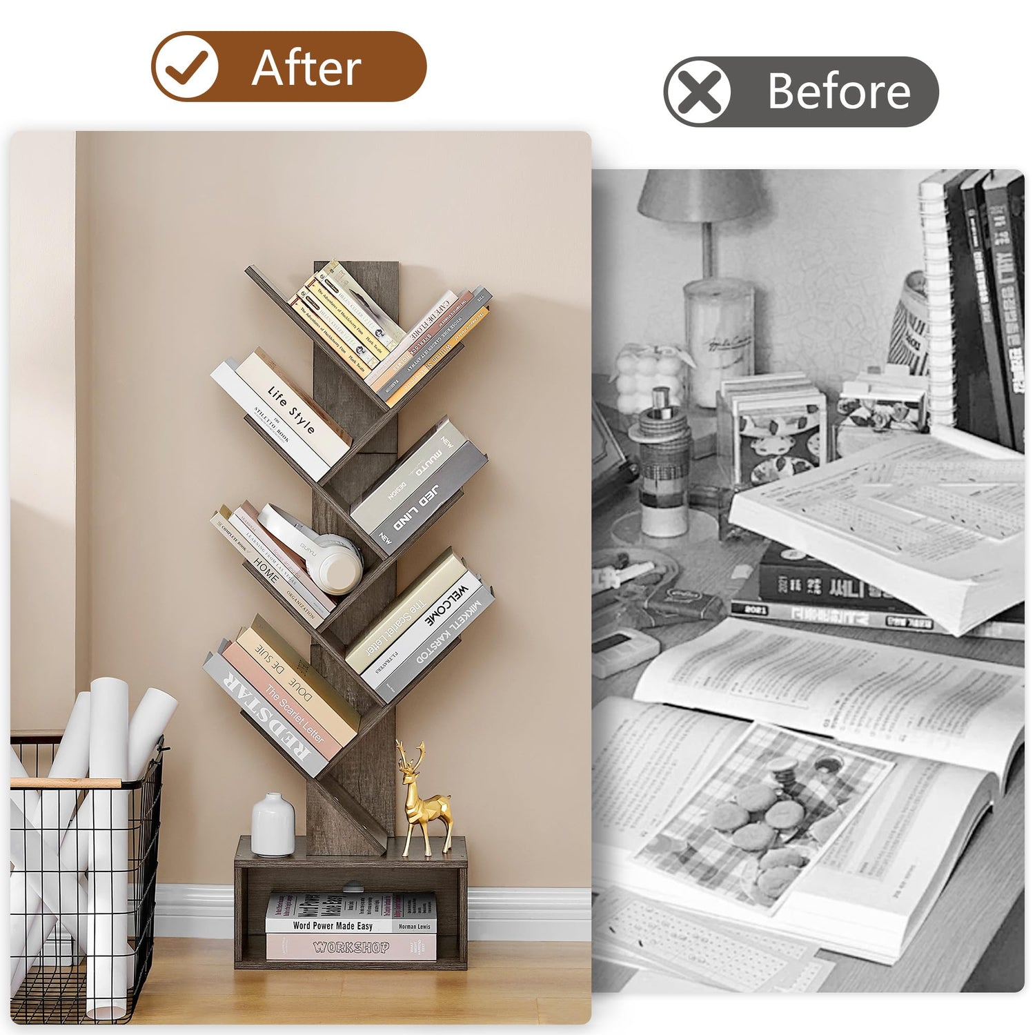 - [Sturdy and Durable Construction with Considerate Design] Built to last, our tree geometric bookshelf is made from premium grade board materials with a reinforced back panel for extra strength. Each shelf can support heavy items without sagging or wobbling. We also added an anti-tip design that is suitable for families with pets.