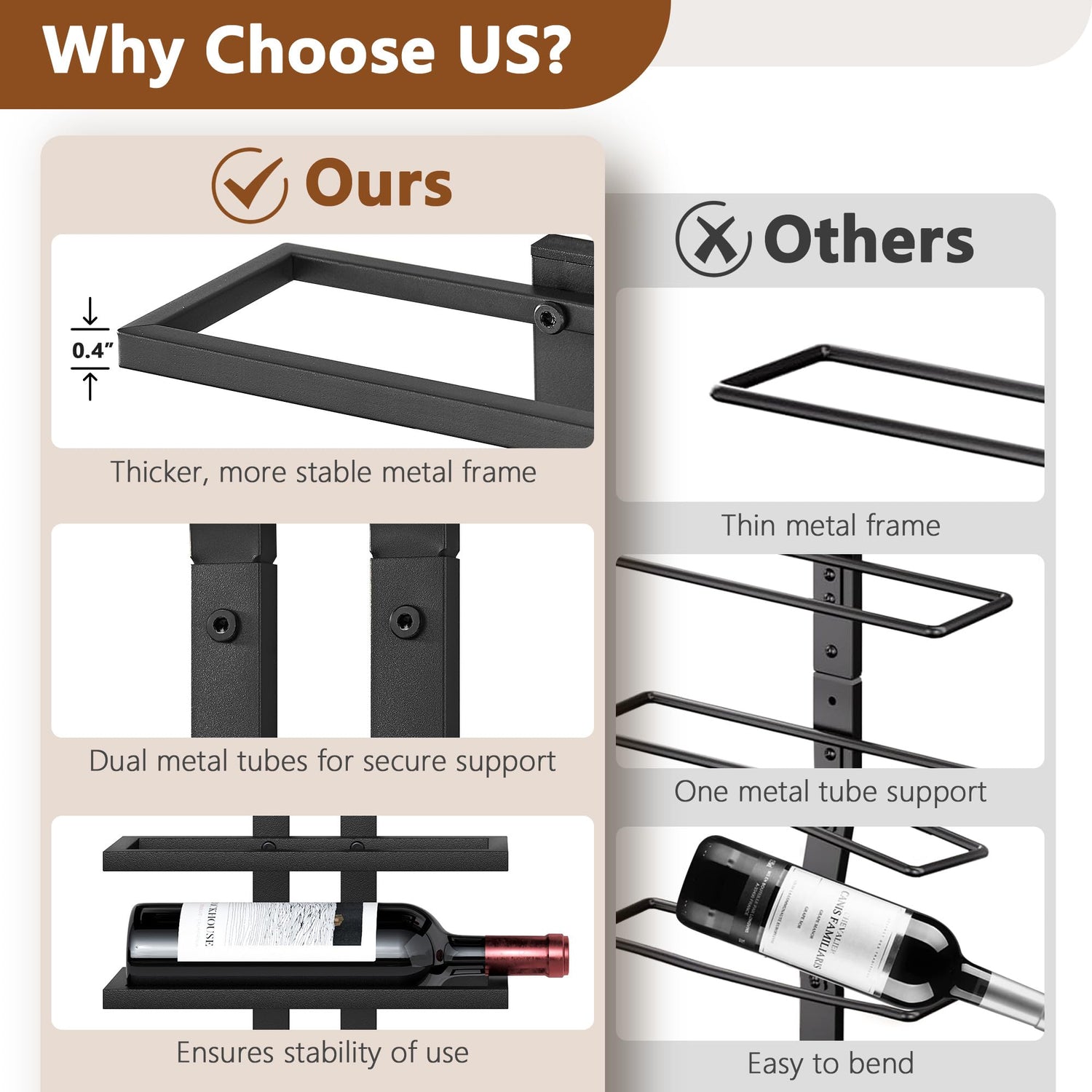 - 【Sturdy Structure】 With metal and high-strength welding technology, and using multiple screws to fix it to the wall, which makes this wall-mounted wine rack is not easy to bend, enough to firmly fix the wine bottles and can be used for a long time.