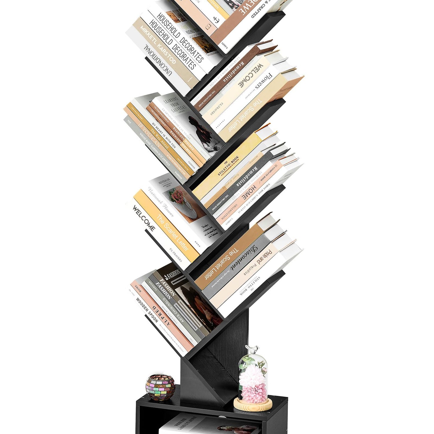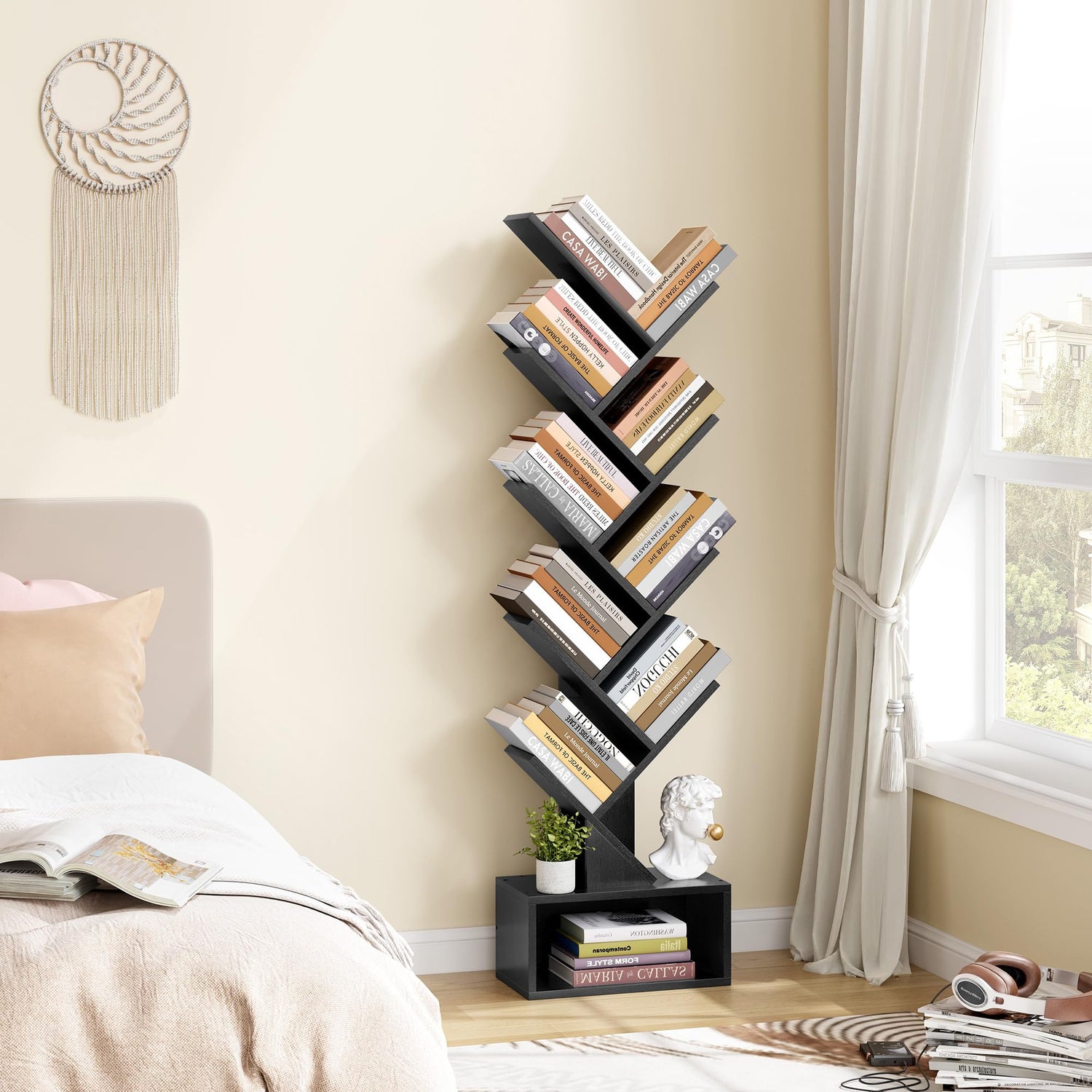 - Space Saving & Ample Storage Capacity: Hoctieon 9-tier tree bookshelf features nine open shelves and a spacious drawer for storage. It provides an ideal solution for organizing books, CDs, magazines, video games, manga, novels, potted plants, photo albums, crafts, and etc. Its slim design allows for easy relocation to any corner or compact area.