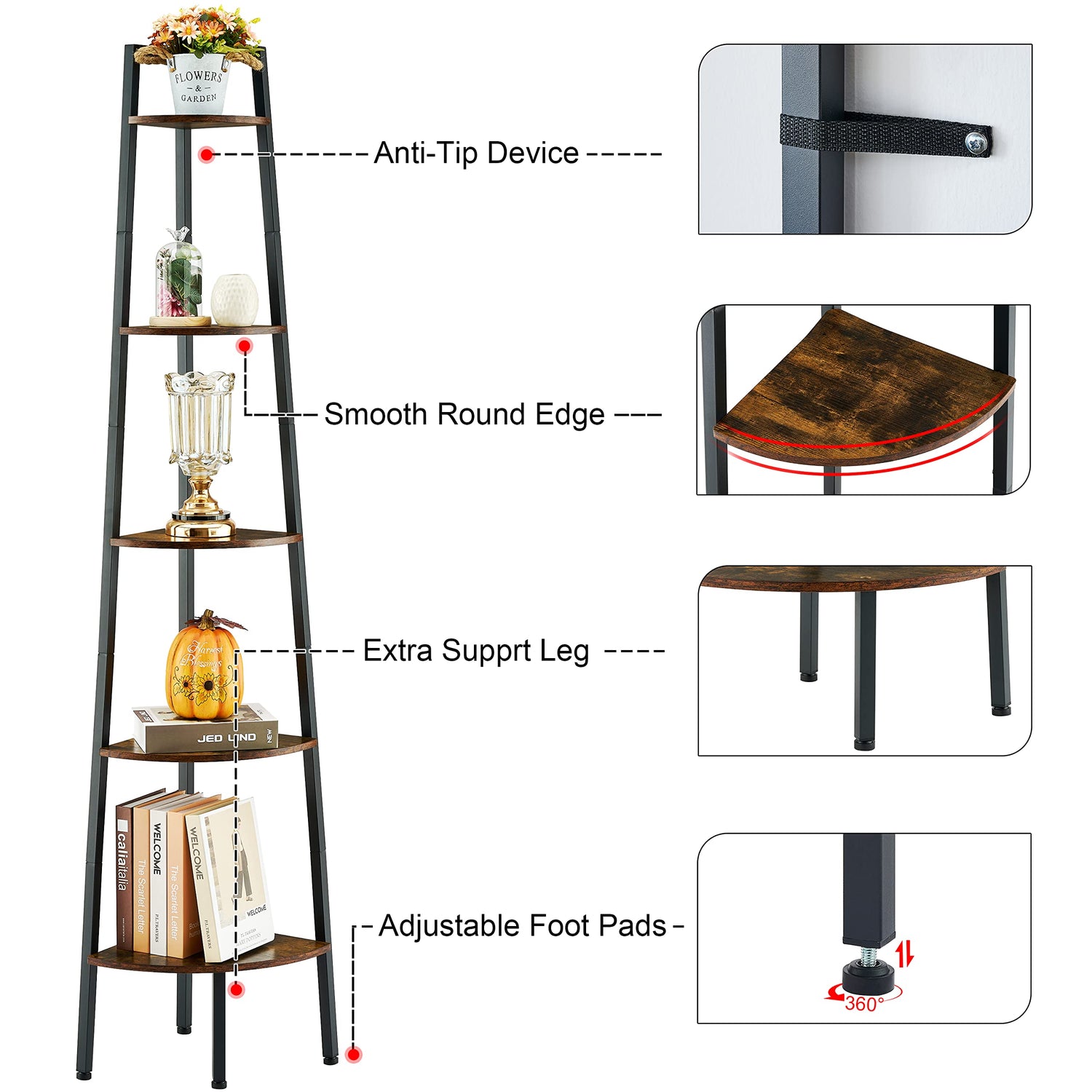 Elevate your home decor with the Hoctieon 5-Tier Rustic Brown Corner Shelf and experience the perfect combination of style and functionality.