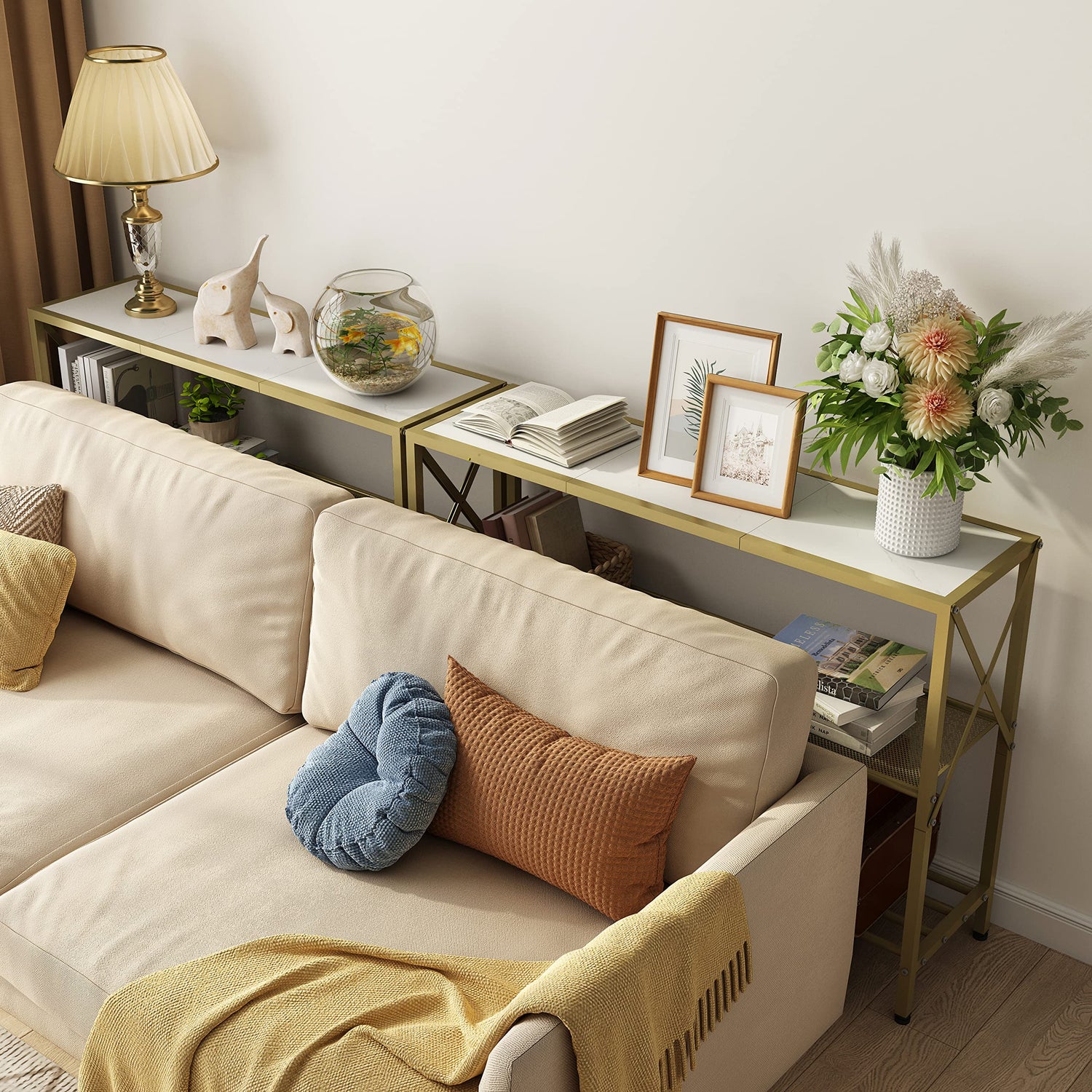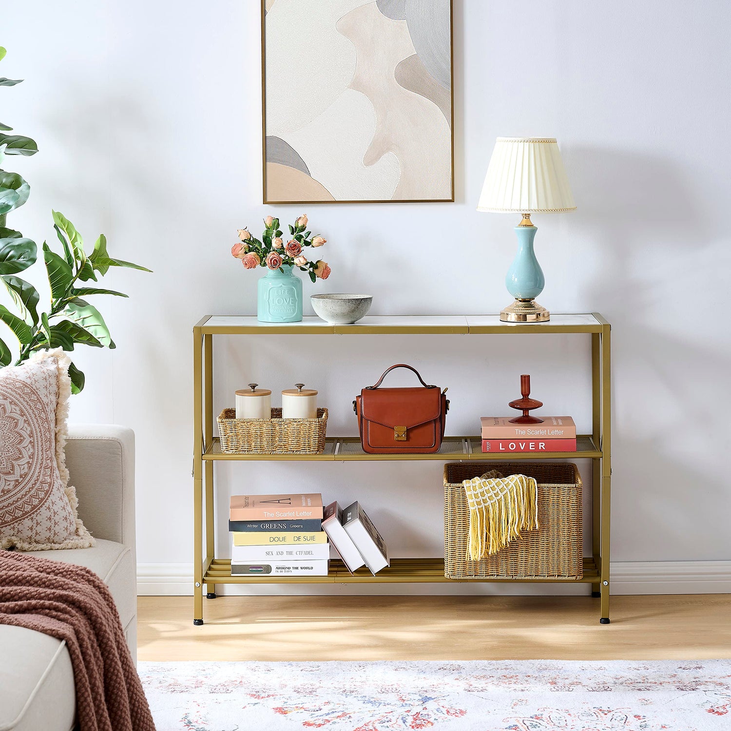 Details: Hoctieon Gold Console Table, 3 Tier Entryway Table, Hallway Table, Narrow Sofa Table with Shelves, Entrance Table for Entryway, Living Room, Foyer, Hallway, Office, Gold And White