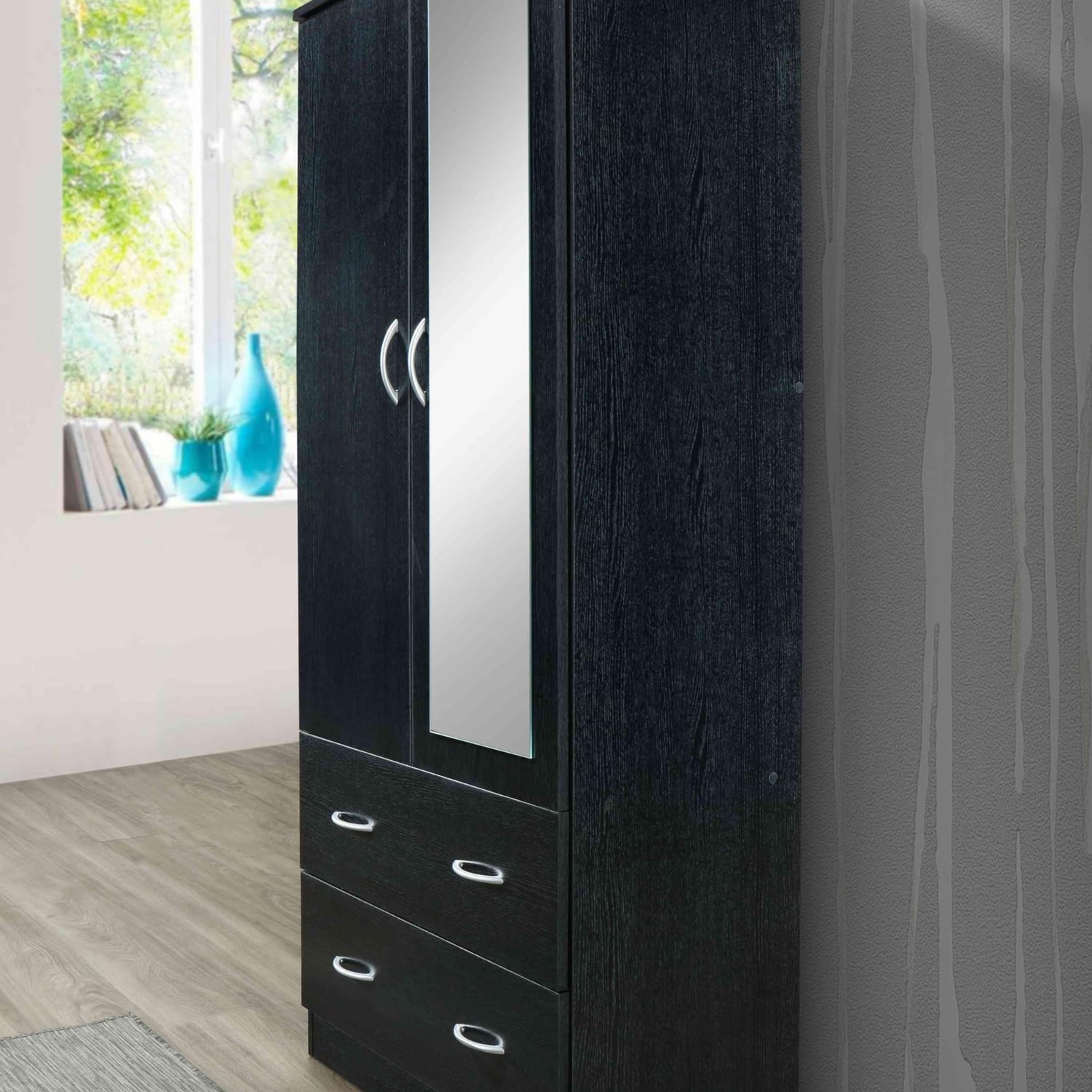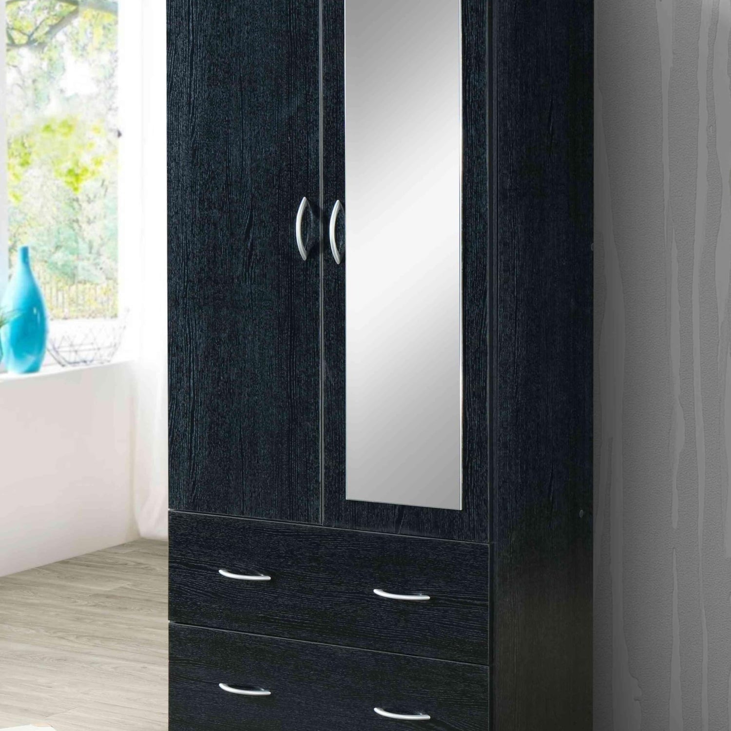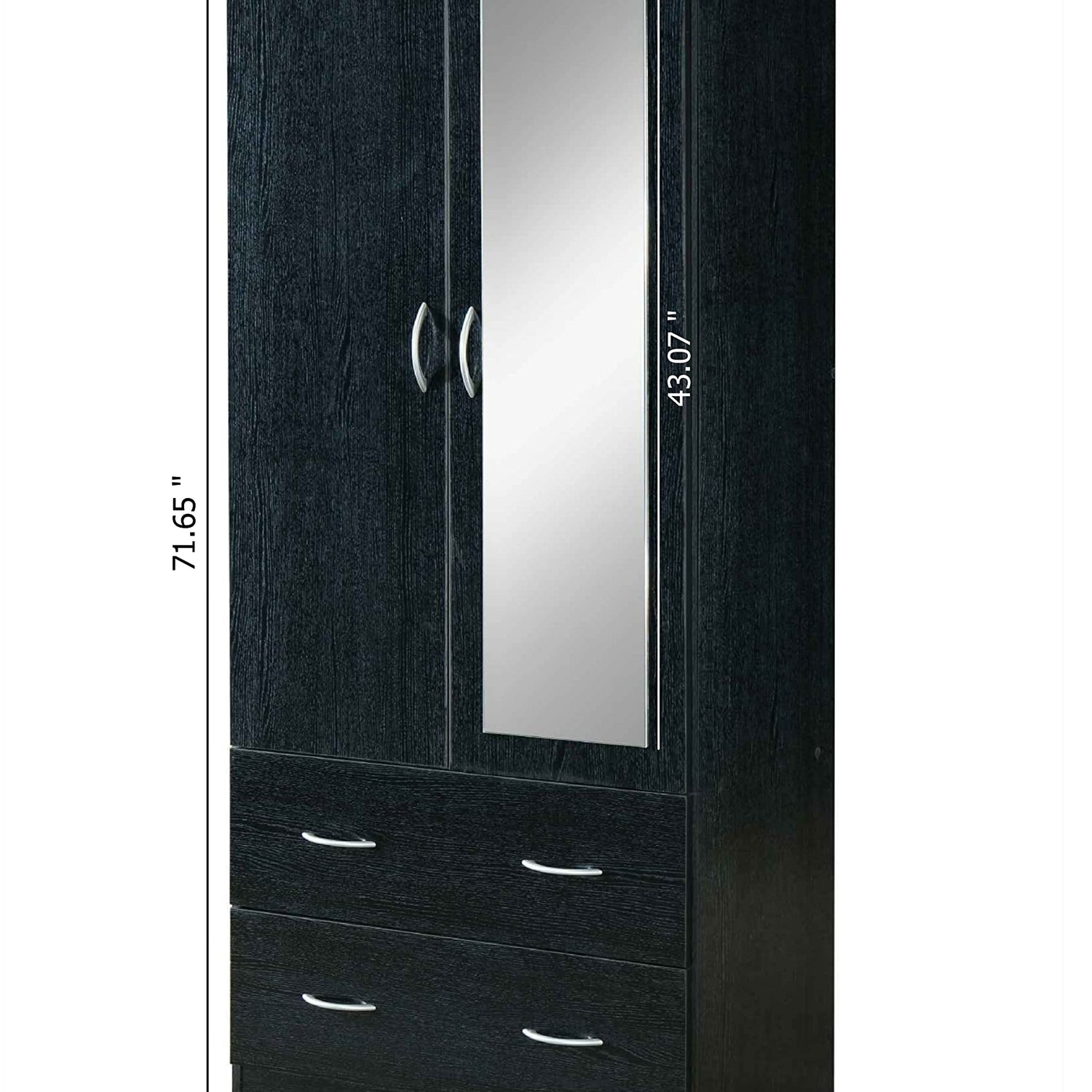 Details: The Hodedah 2-Door Armoire is the perfect stand alone piece of furniture to organize your entire wardrobe. Featuring two doors that easily open to reveal a clothing rod that is best suited to hang your wrinkle prone pieces. The base of this upper compartment serves as a shelf, here you can store folded jeans and t-shirt. The bottom of the closet has two drawers reinforced with metal runners and safety stops that will keep the drawer firmly in place when it is fully opened. Store anything from clothes to linen in these spacious drawers. After picking out our outfit of the day close the doors of this wardrobe to view your style in this almost full body length mirror. We have laminated this piece in a variety of finishes, you can be sure to find the perfect color to blend with your room decor.