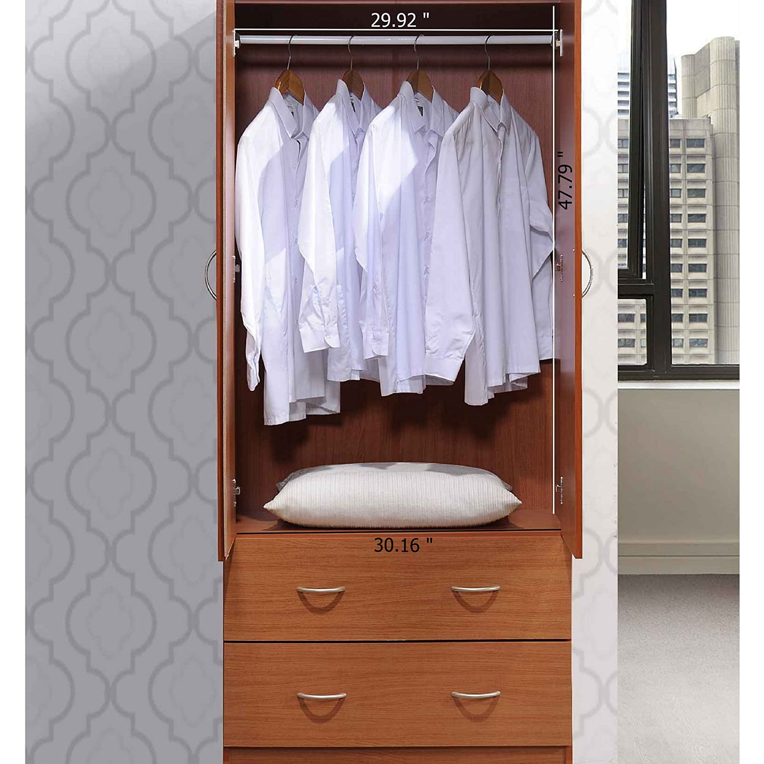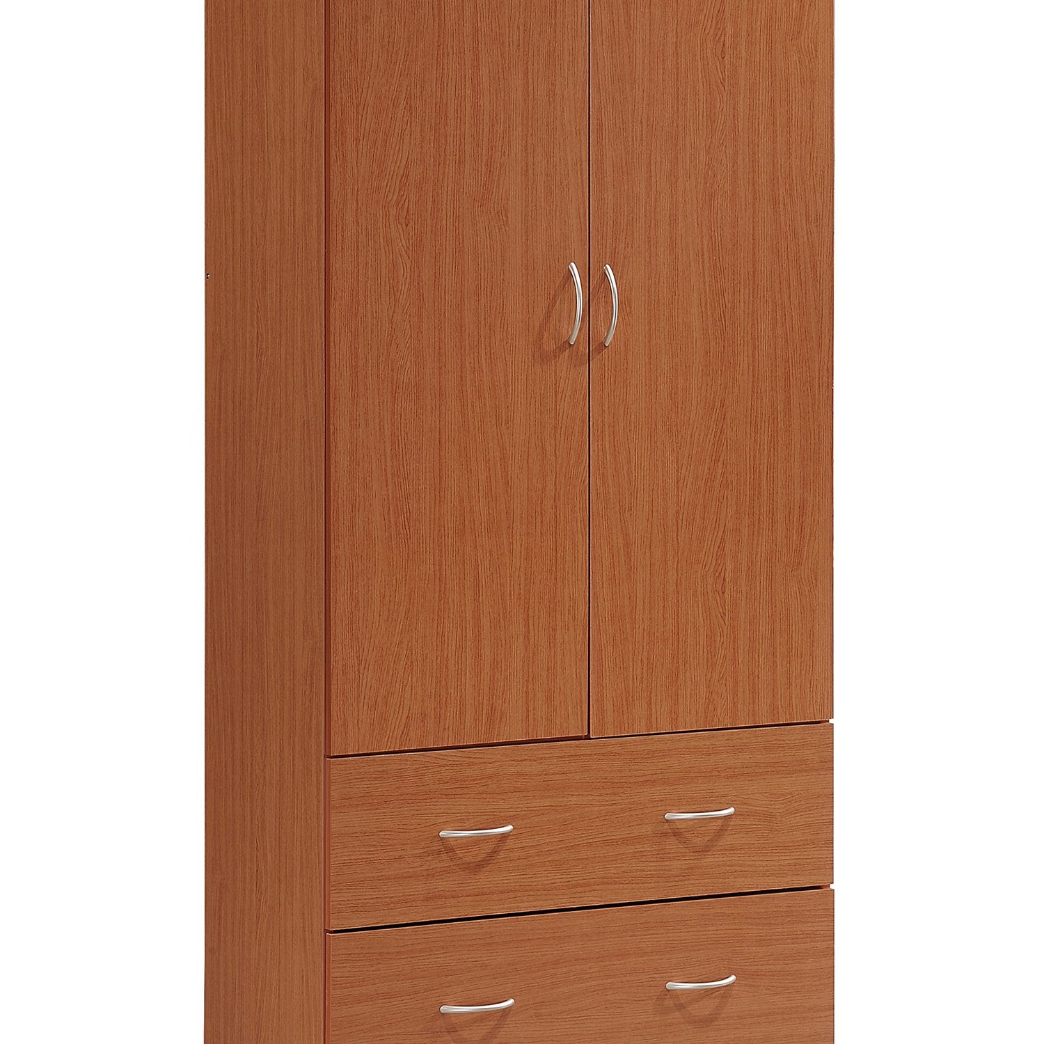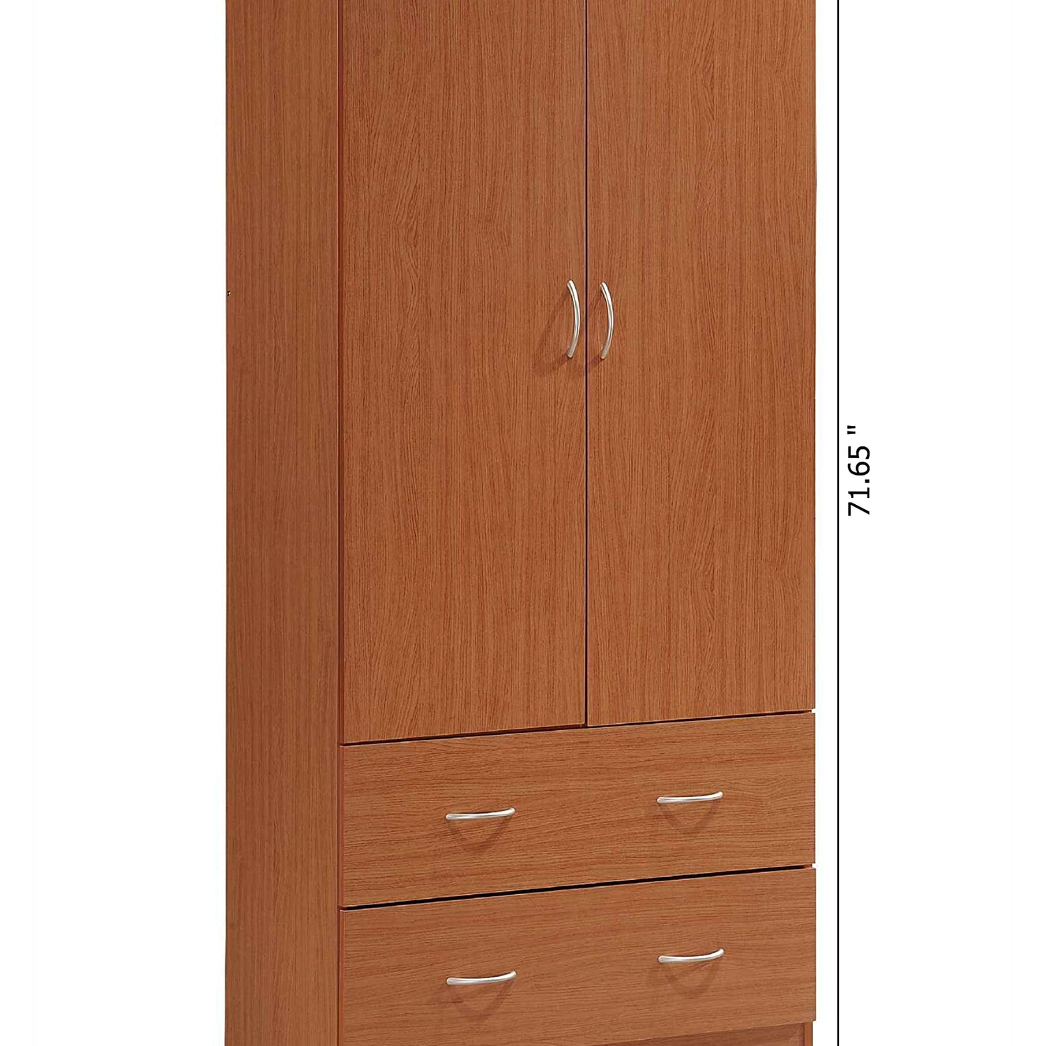 Details: The Hodedah 2-Door Armoire with 2-Drawers is constructed of sturdy, durable, top quality wood. Features a laminated finish in a variety of colors. It has two doors that easily open to a spacious wardrobe. Behind two doors, it is equipped with a hanging garment bar that is the width of closet. The bottom of the closet has two drawers which have metal runners and safety stops that will keep the drawer firmly in place when it is fully opened.