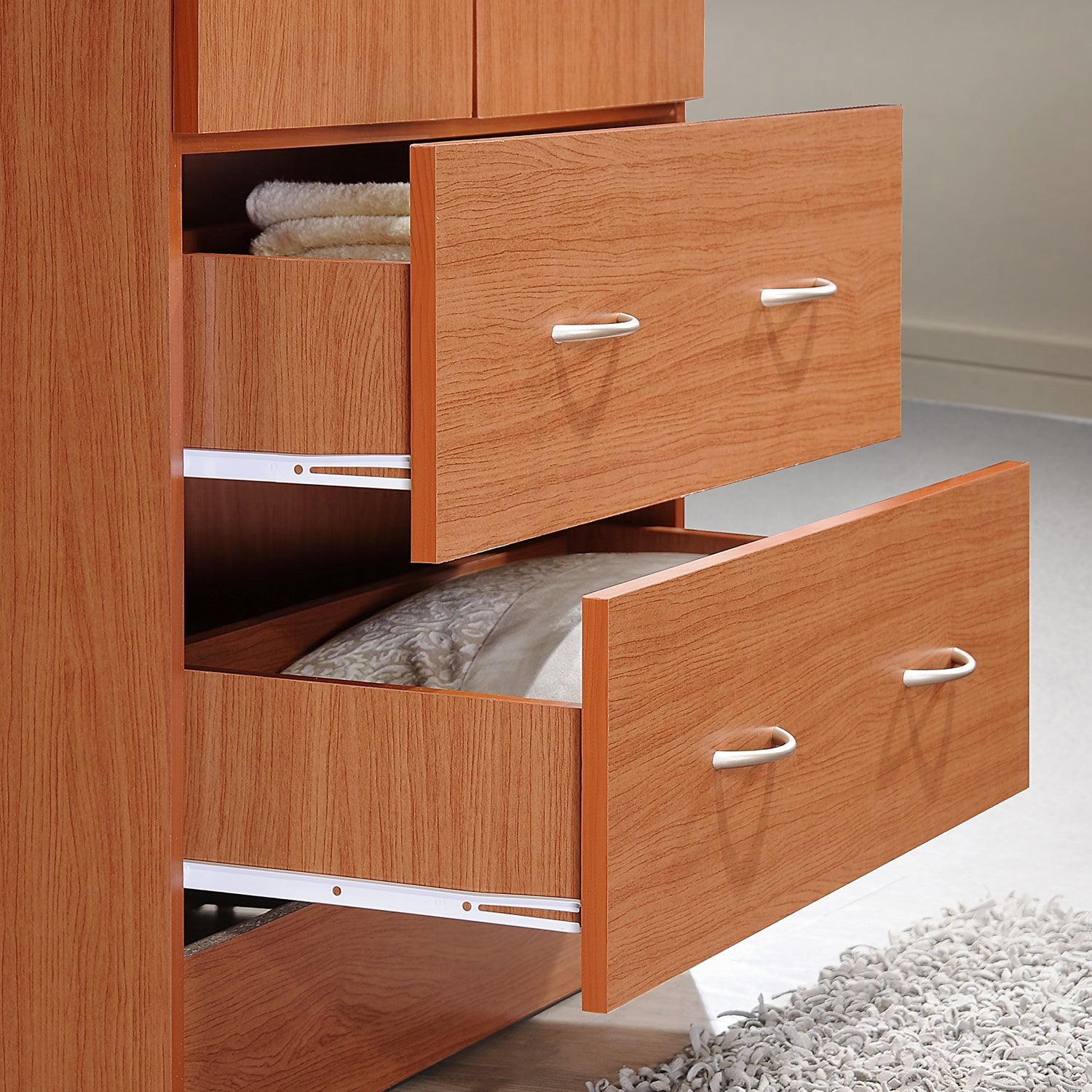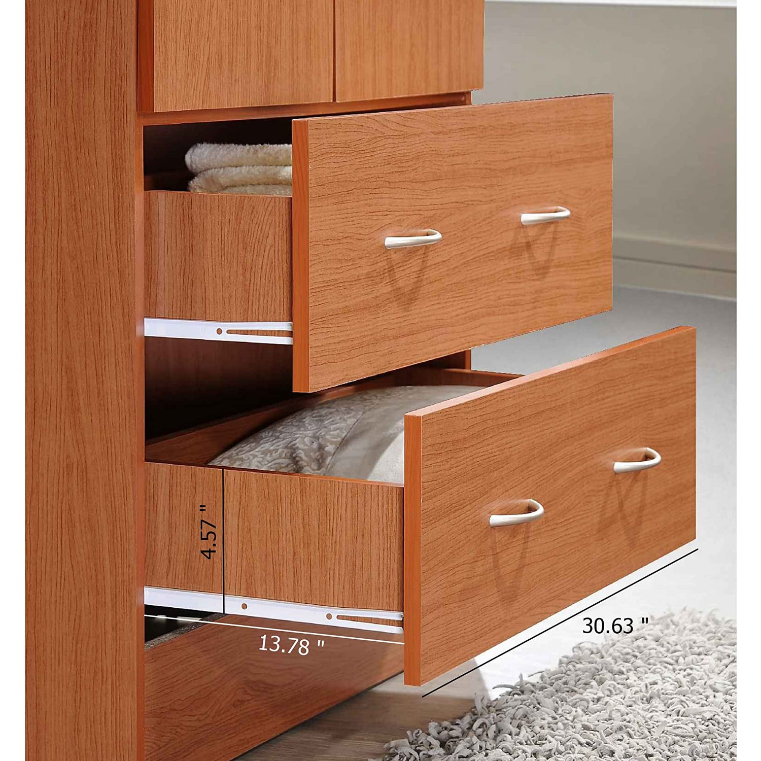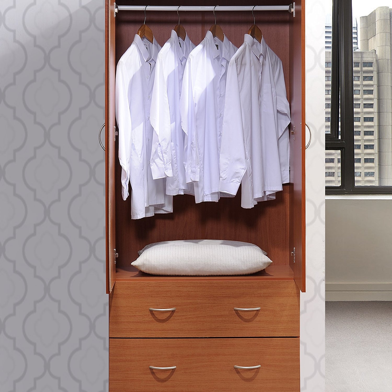 Details: The Hodedah 2-Door Armoire with 2-Drawers is constructed of sturdy, durable, top quality wood. Features a laminated finish in a variety of colors. It has two doors that easily open to a spacious wardrobe. Behind two doors, it is equipped with a hanging garment bar that is the width of closet. The bottom of the closet has two drawers which have metal runners and safety stops that will keep the drawer firmly in place when it is fully opened.