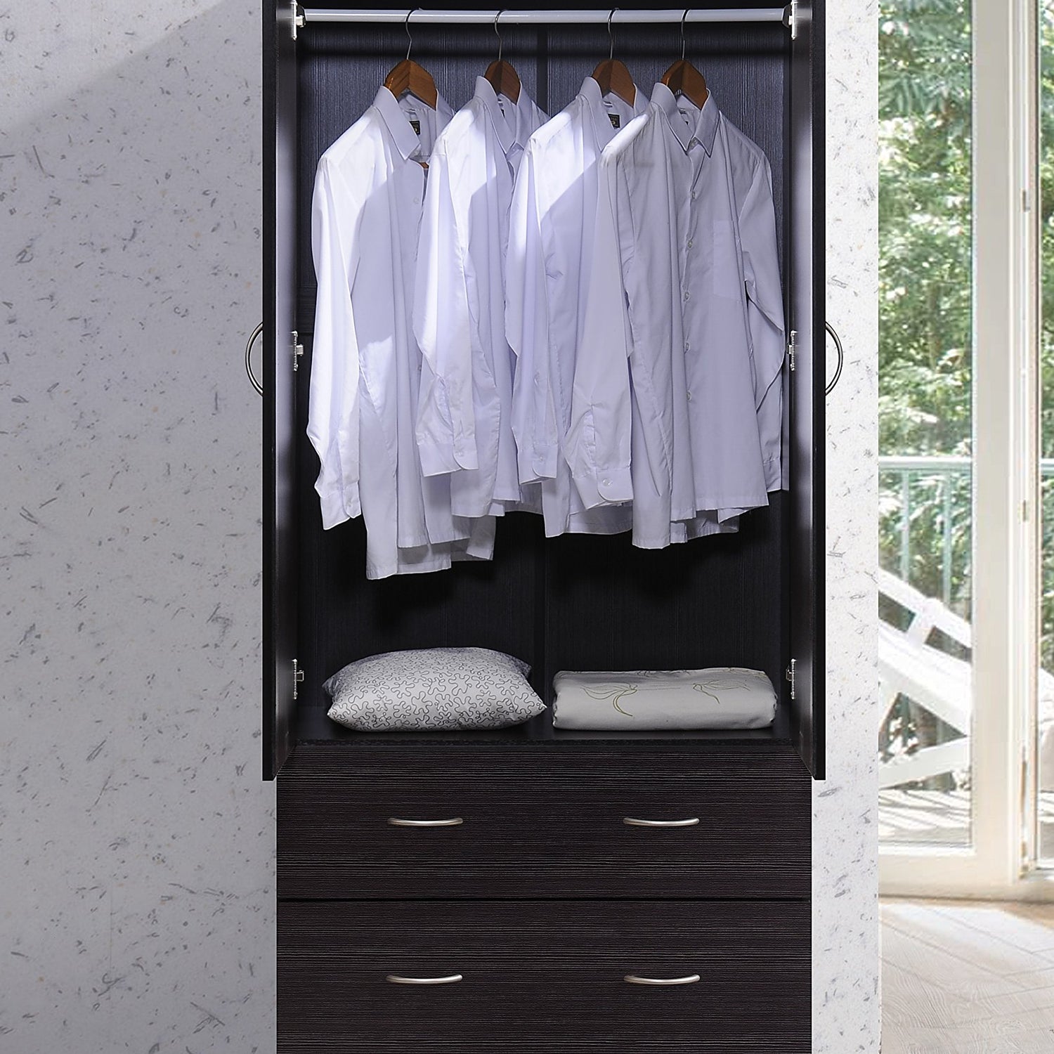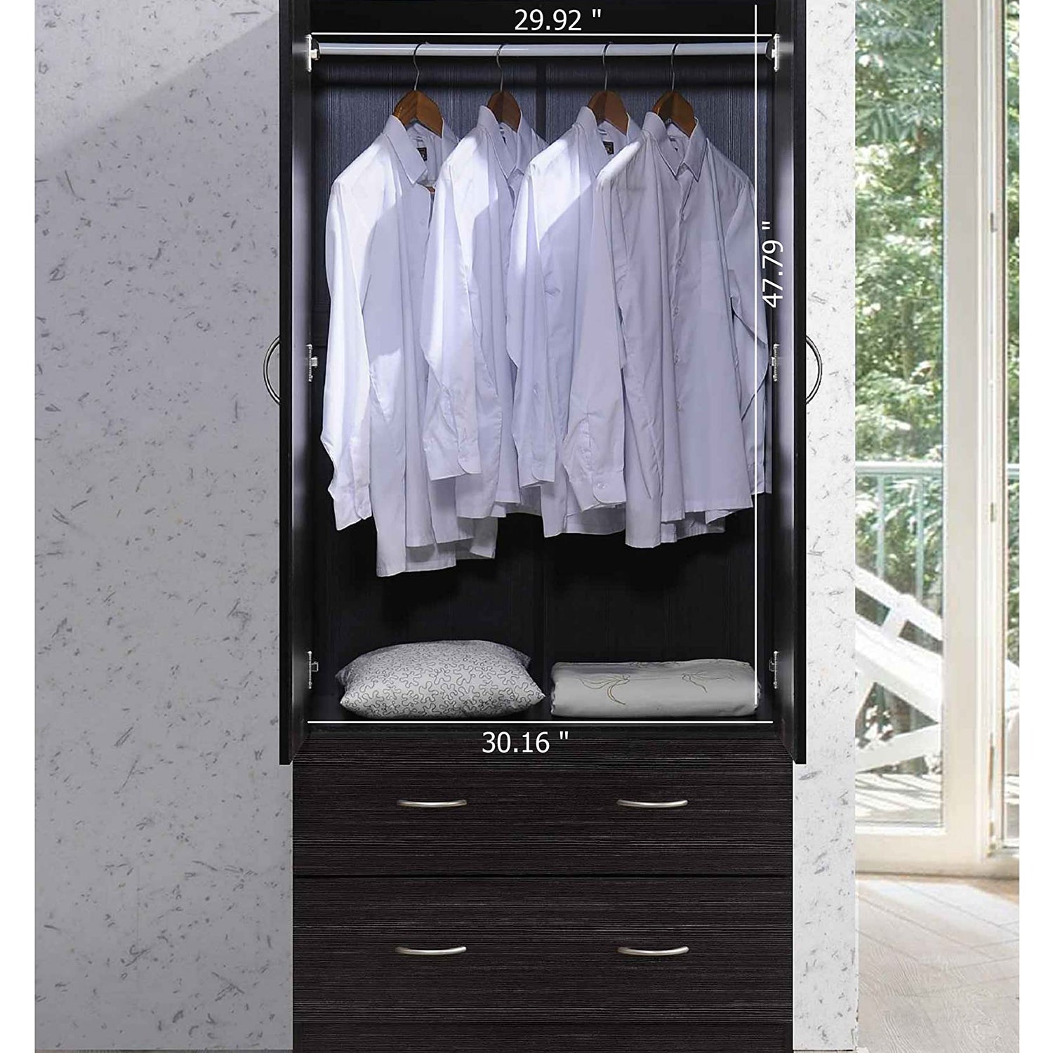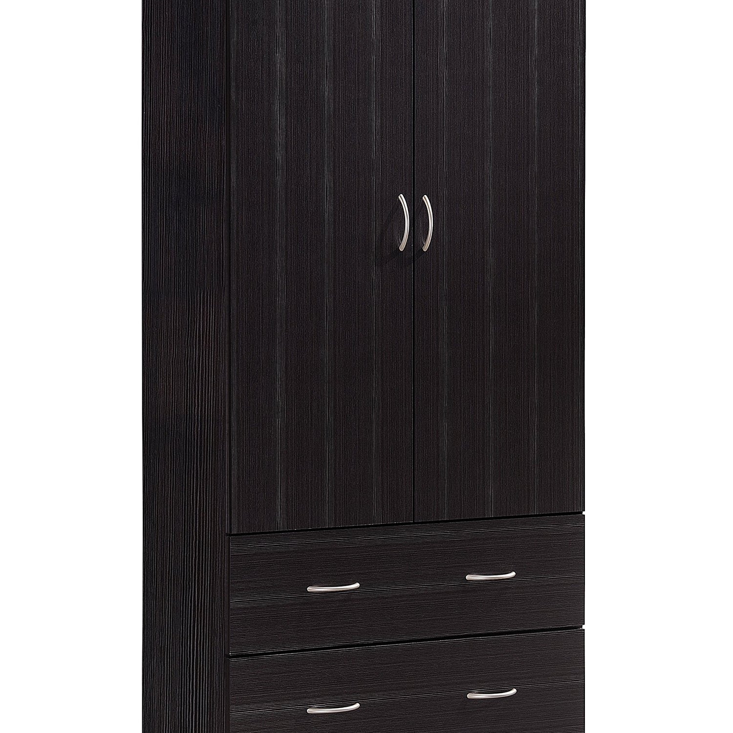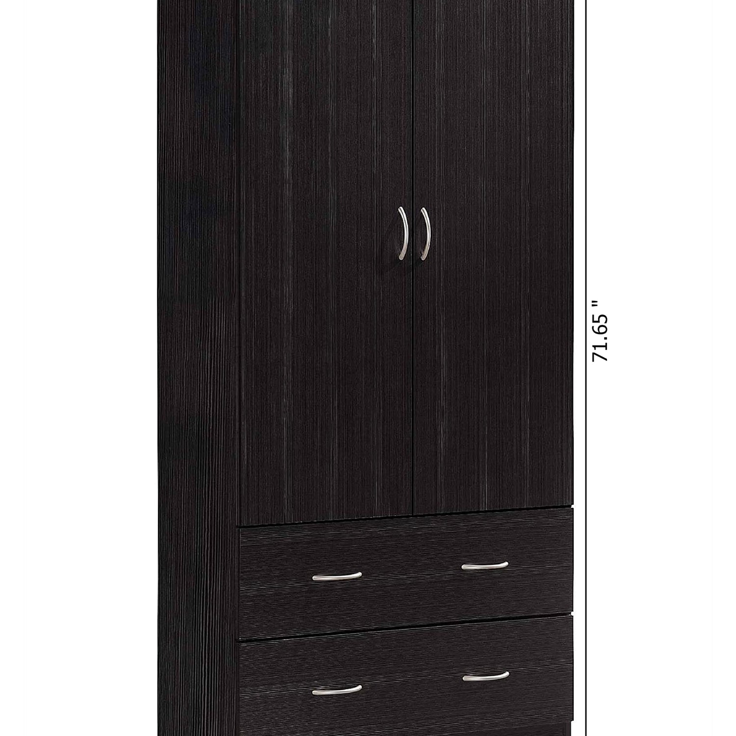Details: The Hodedah 2-Door Armoire with 2-Drawers is constructed of sturdy, durable, top quality wood. Features a laminated finish in a variety of colors. It has two doors that easily open to a spacious wardrobe. Behind two doors, it is equipped with a hanging garment bar that is the width of closet. The bottom of the closet has two drawers which have metal runners and safety stops that will keep the drawer firmly in place when it is fully opened.