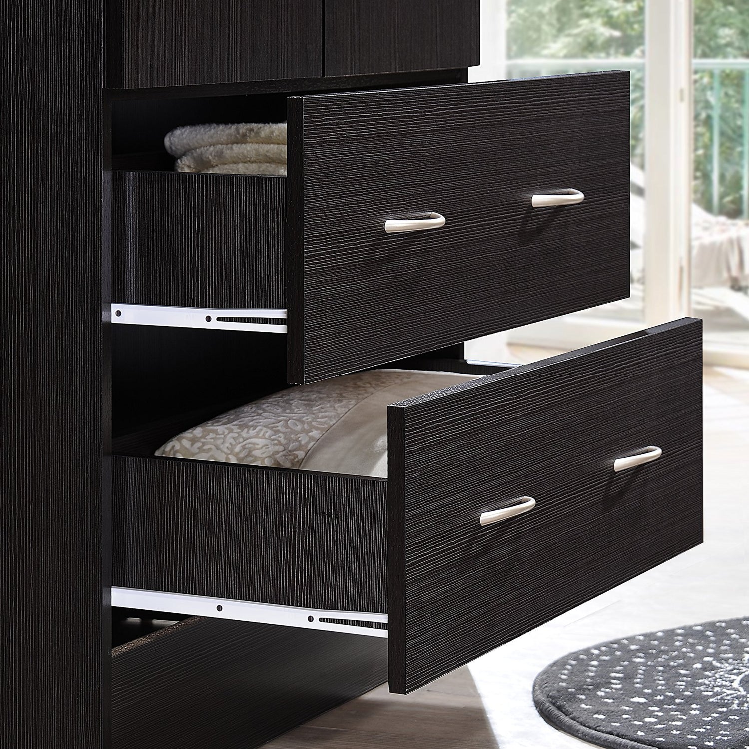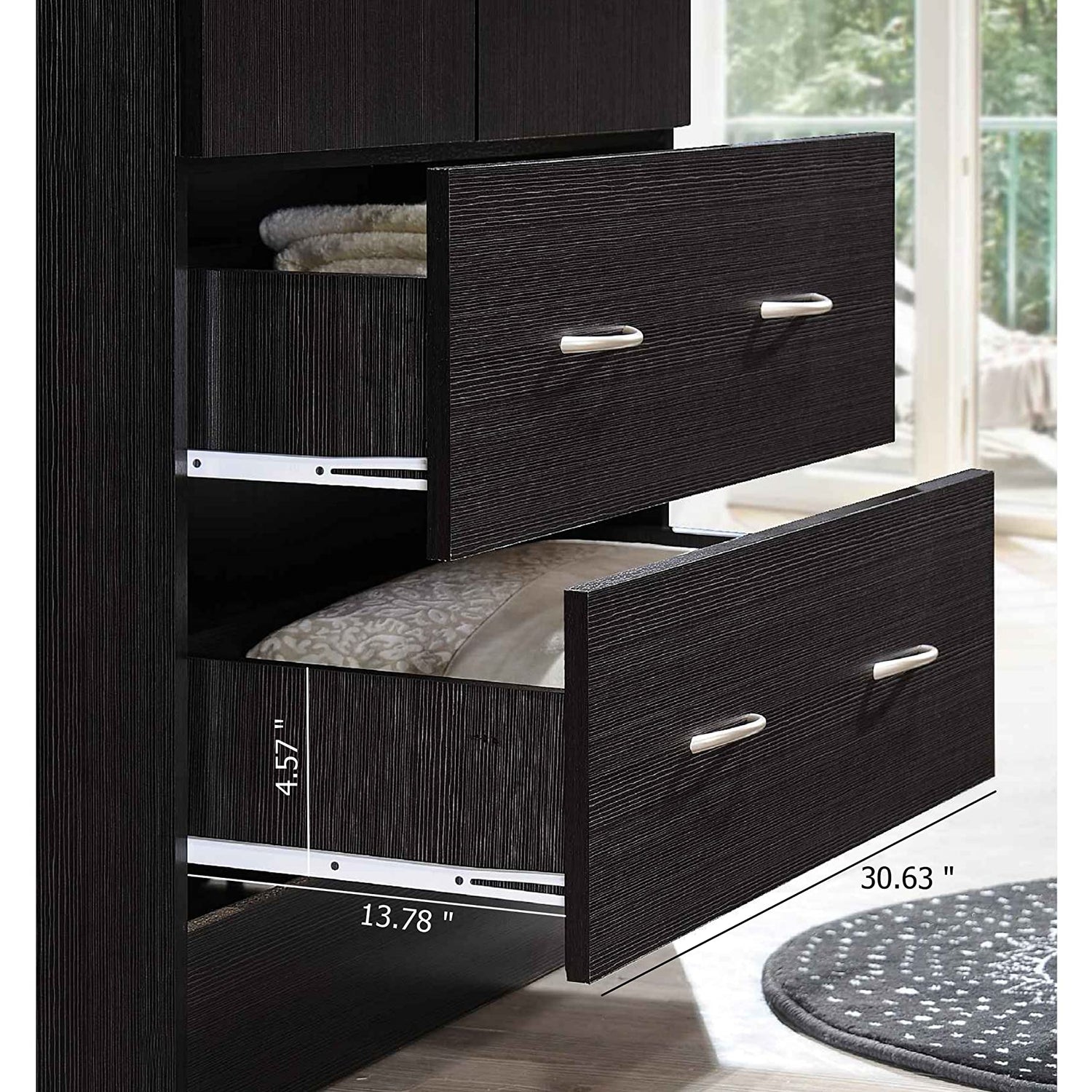- Drawers sit on metal rollers for smooth opening & closing