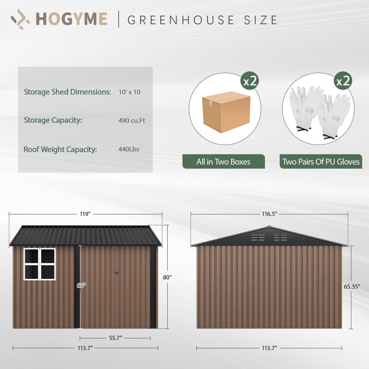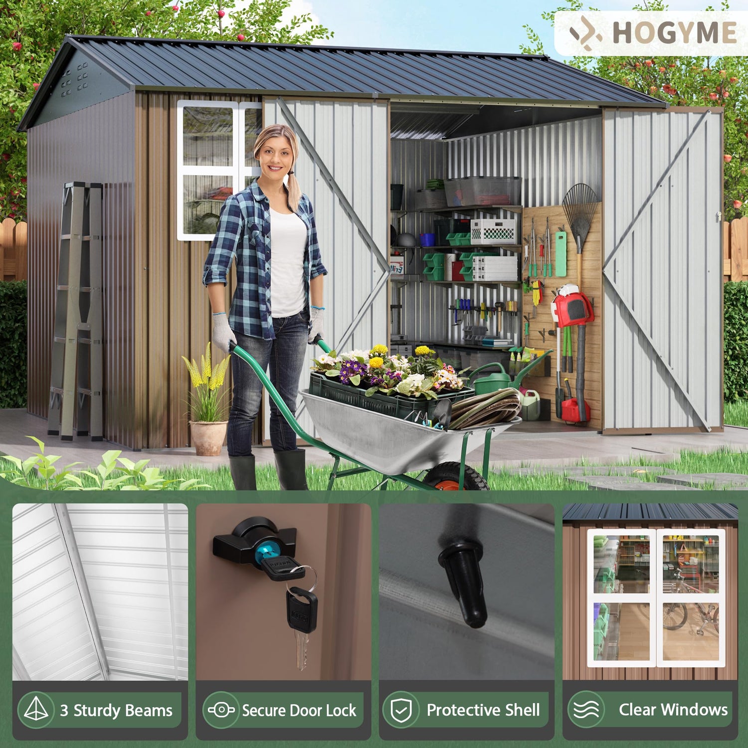 HOGYME 10x10 FT Outdoor Storage Shed, Large Metal Tool Sheds with Updated Frame Structure and Lockable Doors, Garden Shed for Backyard Garden Patio Lawn, Brown