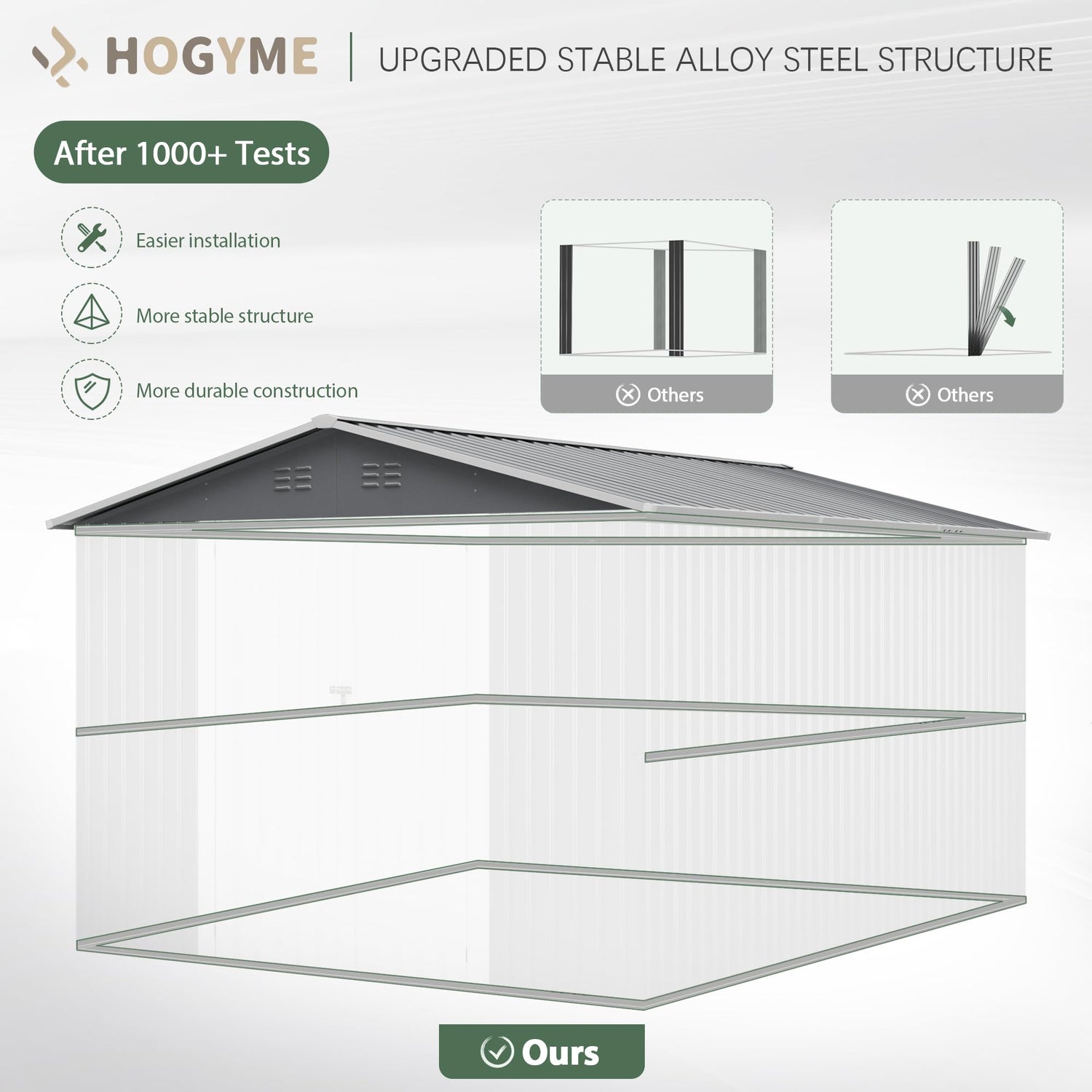 - 【Premium Materials Selection】: HOGYME outdoor shed crafted superior and resilient galvanized steel with waterproof, durable lifetime rust resistant and UV-resistant capabilities. Our shed ensures reliable all-weather protection, enduring even under the most challenging conditions and year-round use.