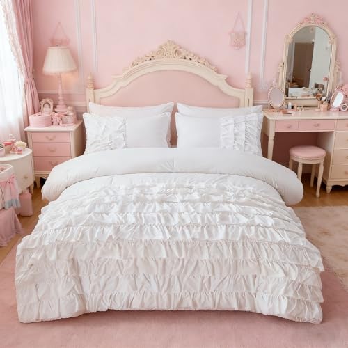 Holawakaka White Waterfall Ruffle Comforter Set Twin Size Multi-Layers Ruffled Shabby Chic 3PCS Bedding Set for Girls Women