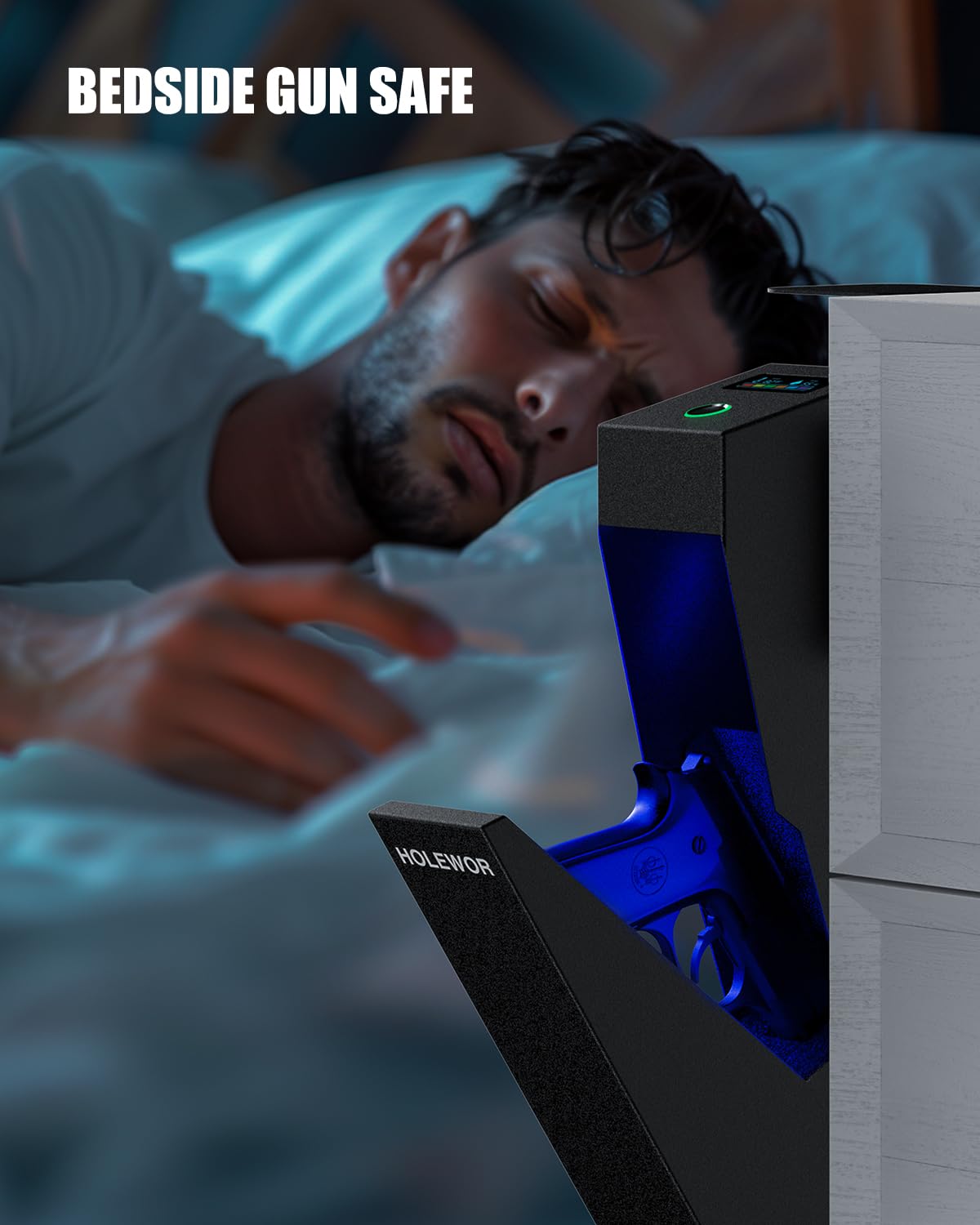 - LED Light: Mount the fingerprint gun safe under your bed or nightstand, easy to get to and open in an emergency. The internal blue LED light automatically turns on when the lid opens, it stays on for about 10 seconds. It's handy if accessing content in the dark.
