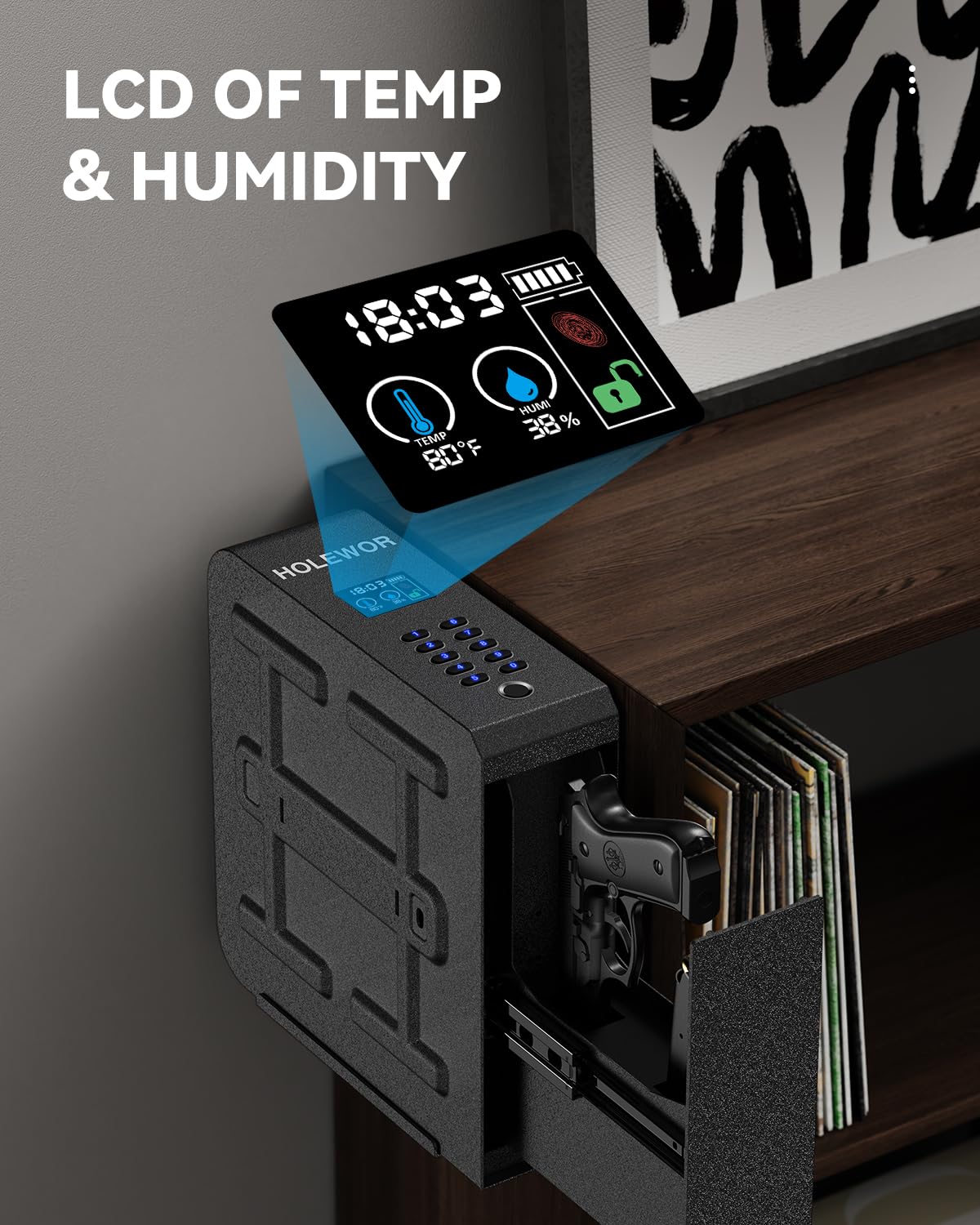 - LCD of Temp & Humidity: You can accurately and quickly know nightstand gun safe of temperature and humidity, if it is too humid you can add dry packs in the safe. Also get the clear reading of the battery level, batteries can be replaced in time.