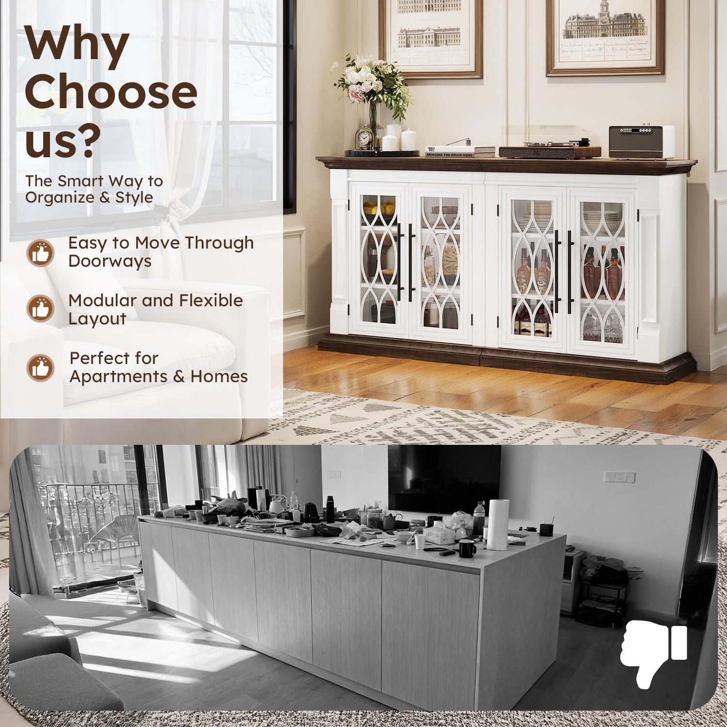 - 【Flexible Storage Space】Maximize space with our 2-in-1 modular design. Arrange together or separately across rooms—perfect for kitchen pantries, entryways or living room entertainment centers.Comprising 2 separate sideboards with removable shelves inside, max internal height 26.8" ideal for wine racks) fit microwaves, kitchenware or wines—an organizational powerhouse for dining rooms/kitchens.(and doors without lock).