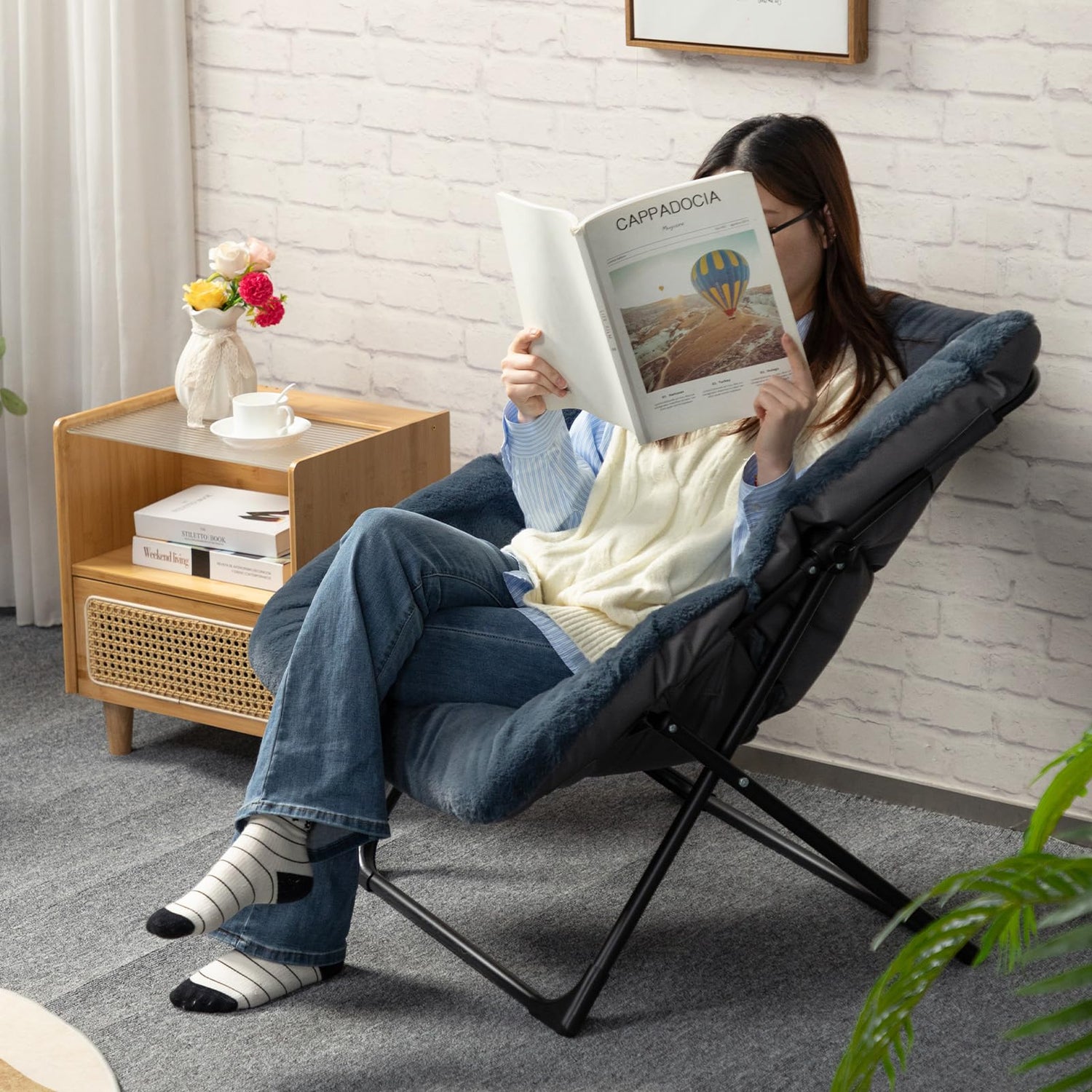 HollyHOME X-Large Saucer Chair, Comfy Oversized Folding Chair, Faux-Fur Reading Chair for Teens, Adults, Foldable Accent Lazy Chair, Metal Frame Lounge Chair for Living Room, Bedroom, Dorm, Navy Blue
