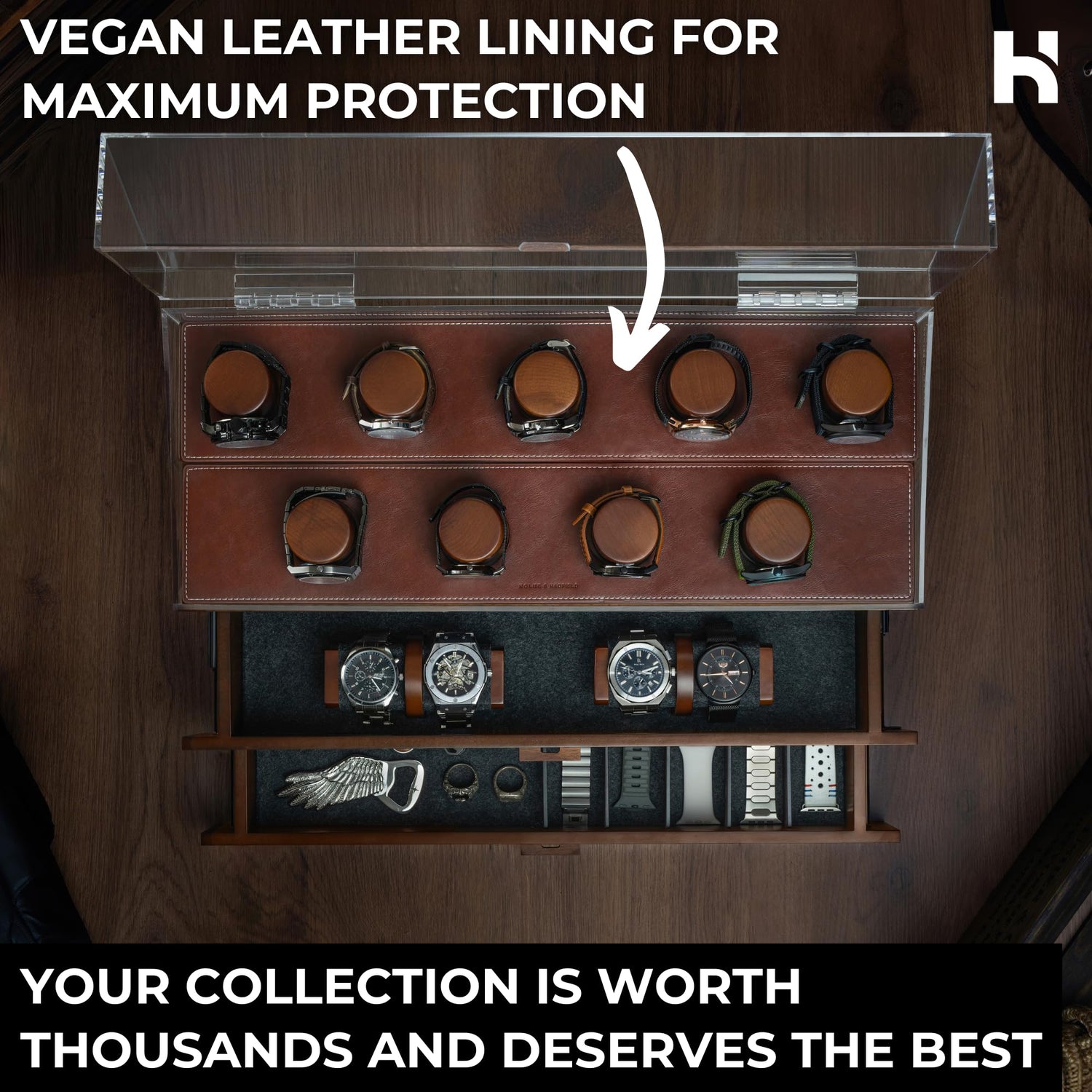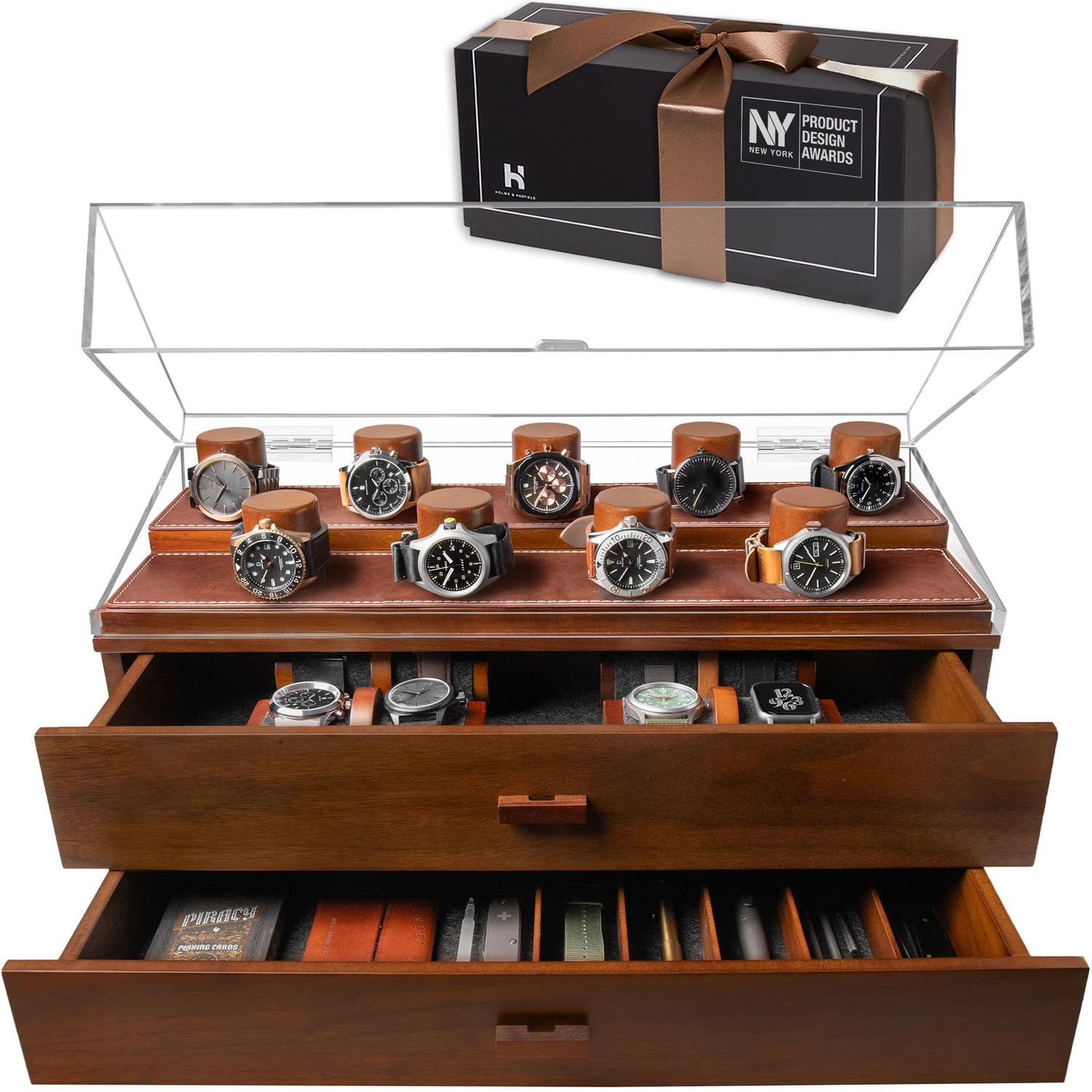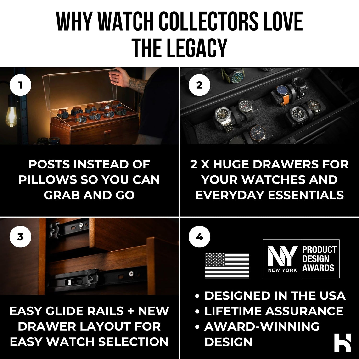 - CAPTIVATING 360° VIEWS — The Legacy watch box for men is simply on another level. With its two-tier top deck and easy to use solid wood pillars, you can effortlessly showcase your 9 best watches for mesmerizing 360° views. Thanks to the clear hinged acrylic cover, you not only shield your watches from dust and scratches but also enjoy quick and easy access to your prized timepieces.