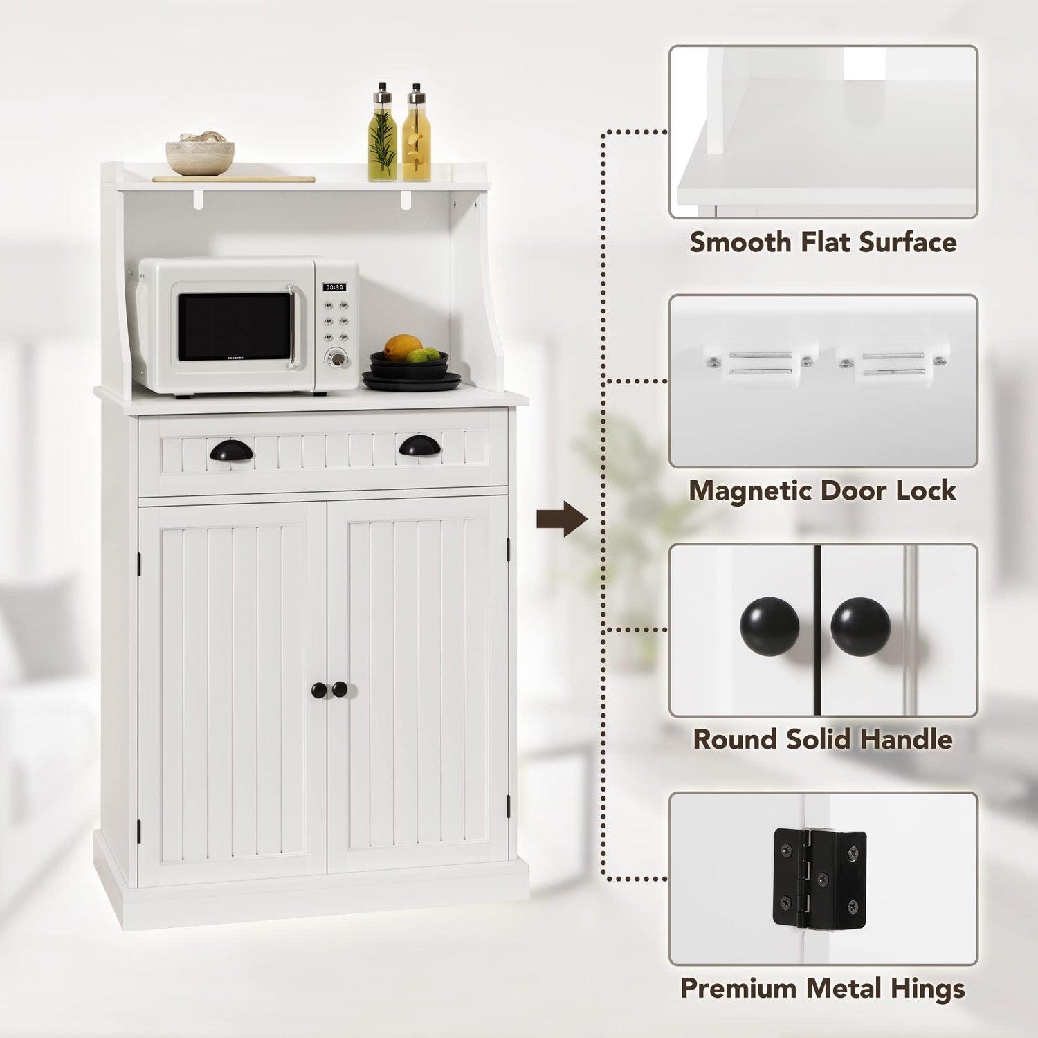 - 【Ample storage space】This kitchen pantry storage cabinet features one microwave countertop, 2 doors cabinet, one large drawer and an adjustable shelf which allow you to adjust the height in 3 levels to meet your individual needs. It is a perfect storage option for storing living goods, small appliances, cookware, and a variety of kitchen supplies.