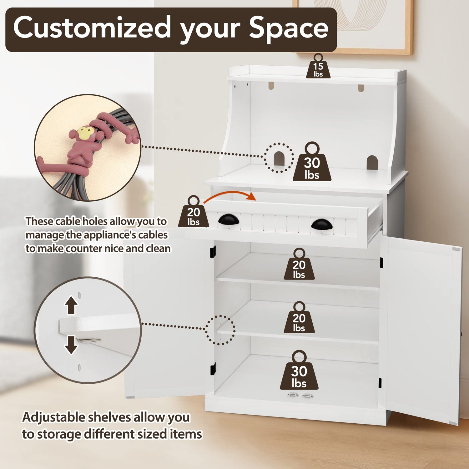 - 【Perfect Solution for Kitchen】Kitchen storage cabinet with microwave stand is the newest design,it has vertical smooth line on the panels, and pure white modern colors overall the entire product. Use kitchen stand allows you to access plenty of storage space without taking up too much space.