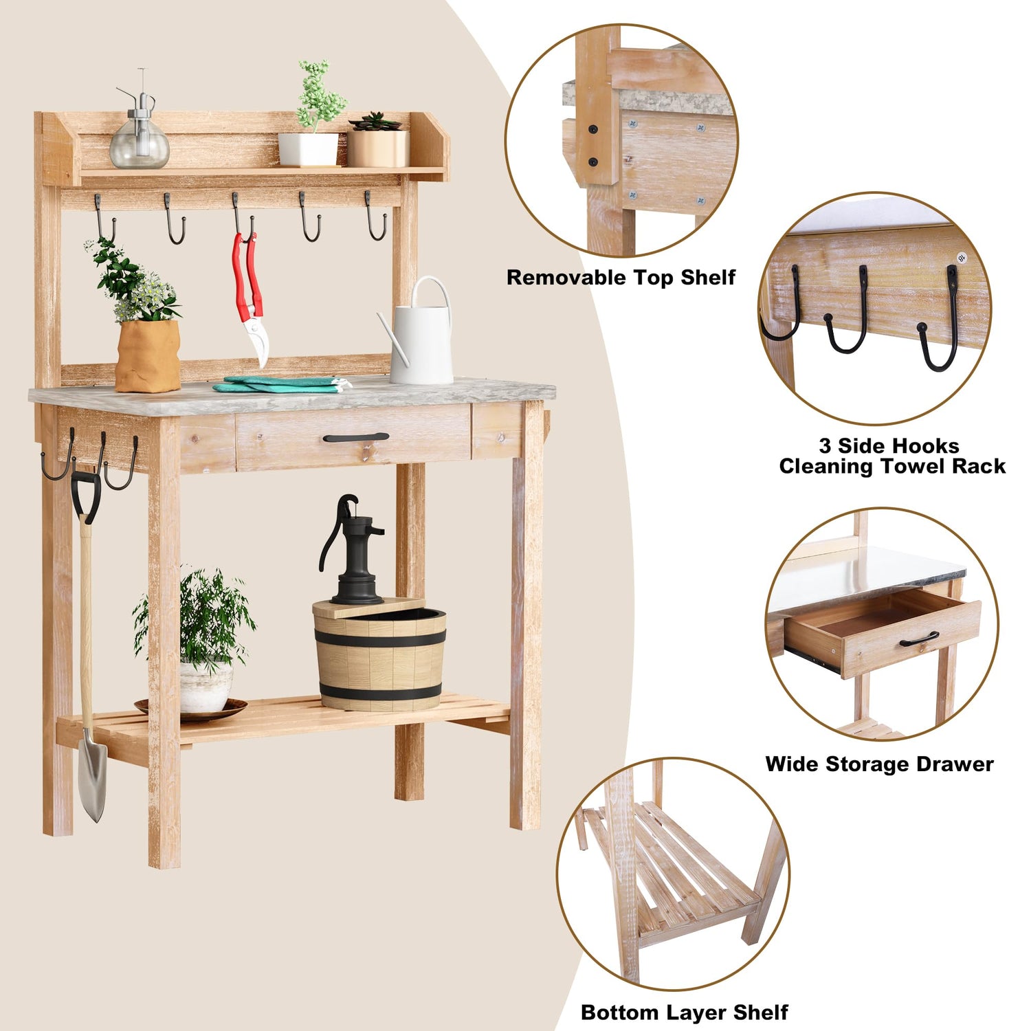HOLTICO Outdoor Potting Bench Table with Metal Tabletop, Planting Table Potting Work Station with Storage Drawer and Removable Shelf Rack, Garden Potting Table for Outdoors