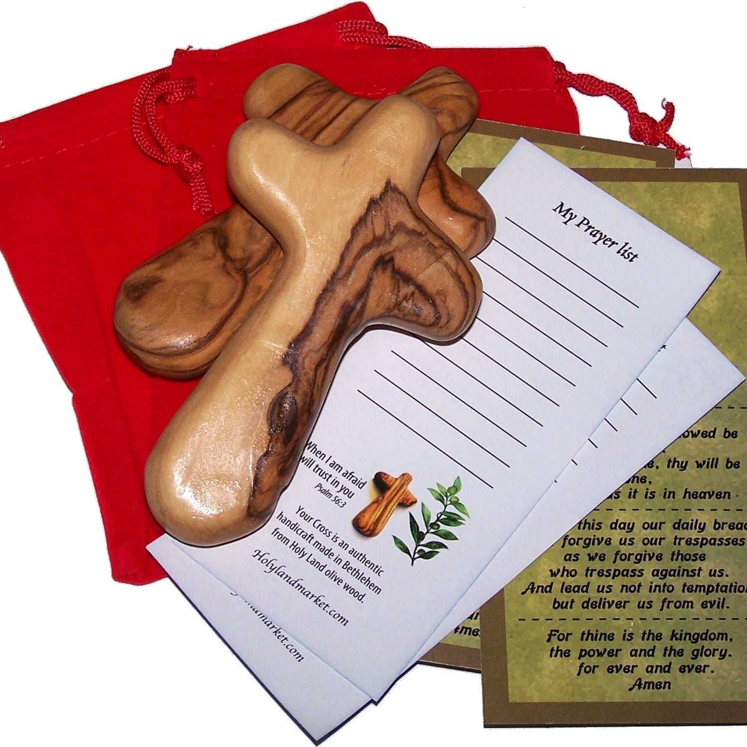 • 2 Olive Wood Holding Crosses, 2 Certificate of Authenticity, 2 Velveteen Bags.