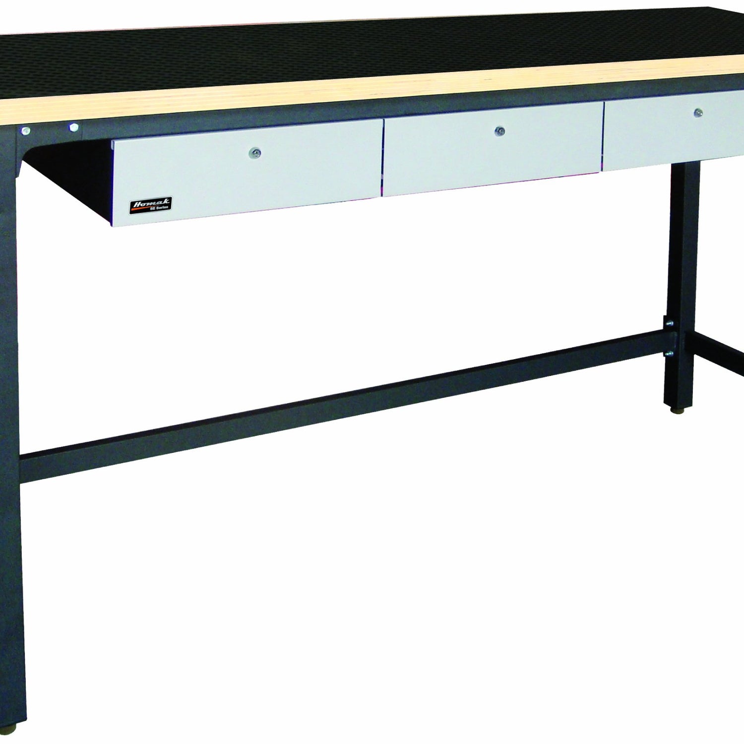 This heavy-duty Homak steel workbench is a perfect fit in the professional shop and right at home for the DIYer. It handles up to a 440-lb. Load capacity and offers a large work space to get your projects completed. The 79in. Over 6 1/2 feet long workbench fits perfectly in your garage, shop or basement and offers the ideal height to comfortably stand or sit while working. Features a 1 1/2in. Thick wood working surface and three locking steel drawers underneath. This versatile workbench delivers quality and dependability for many years of serious project work, repair jobs, woodworking and home improvement projects. Capacity lbs. 440, drawers Qty. 3, includes 3 drawers, 1 set of keys, top material wood, material steel, wood, Dimensions W x D x H In. 78 3/8 x 23 5/8 x 42 1/8. High quality 1.5mm steel frame 1.0 mm steel drawers 1.5in. Thick laminated wood top is durable can mount a vise or Grinder to top surface Hmc high security tubular locks 440-lb. Frame capacity 45-lb. Capacity per drawer 78 3/8in.W x 23 5/8in.D x 42 1/8in.D overall dimensions 14 3/4in. X 18in. X 4 1/2in. Drawer dimensions