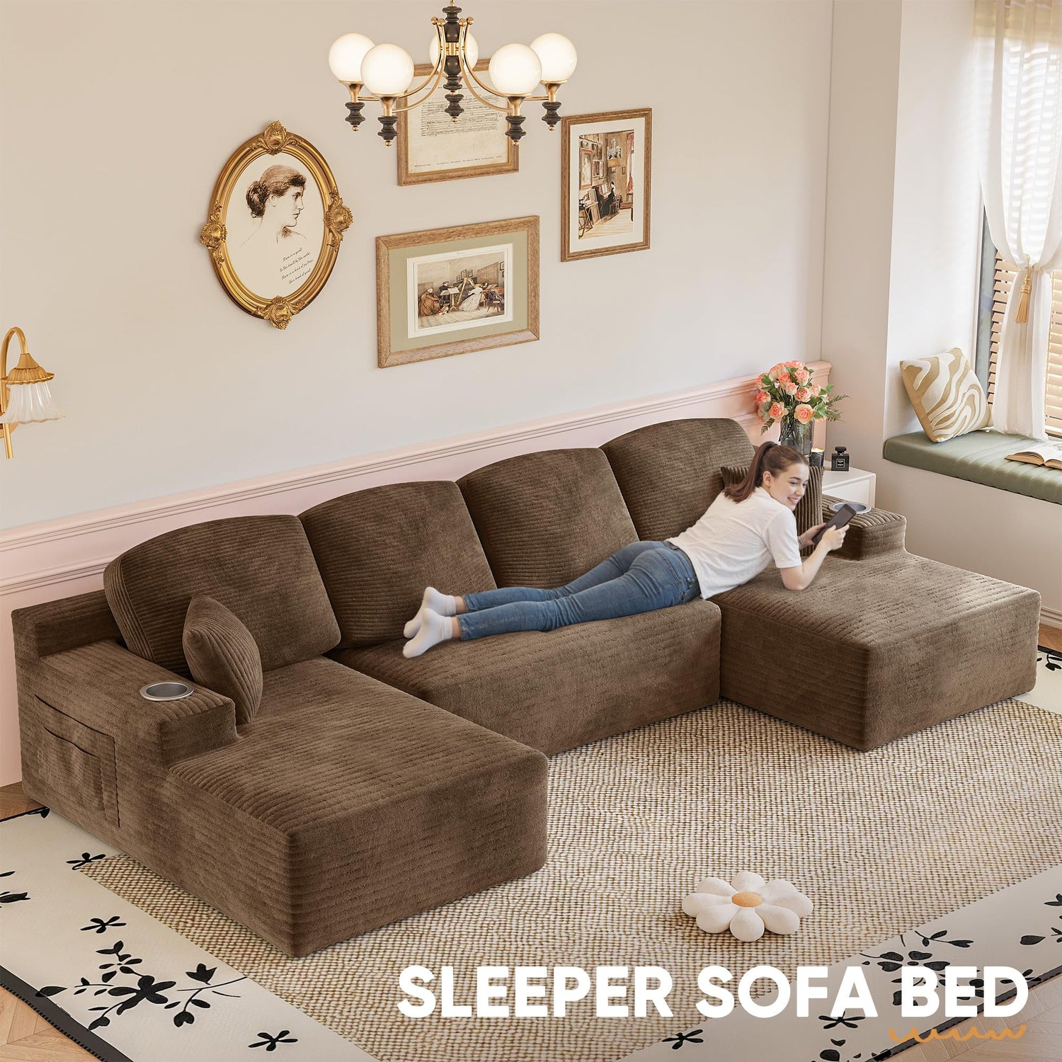 Homall 142" Boneless Couch, Modular Sectional Sofa, No Assembly Required, Memory Foam Filling, Corduroy U-Shaped Sofa, Movable Multi-Person Couch for Living Room (Brown)
