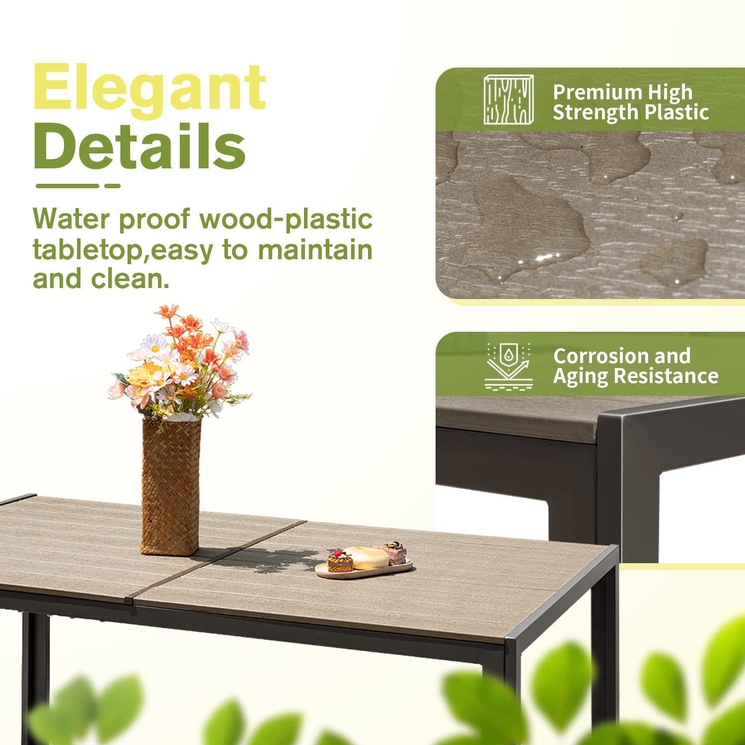 - Large Table Top: The large 59*35 inch tabletop allows you to enjoy a variety of food and drinks. The surface of the table is made of faux wood plastic, and the wood grain makes the table more textured. The specially coated table top is weather resistant, making the table more suitable for outdoor use