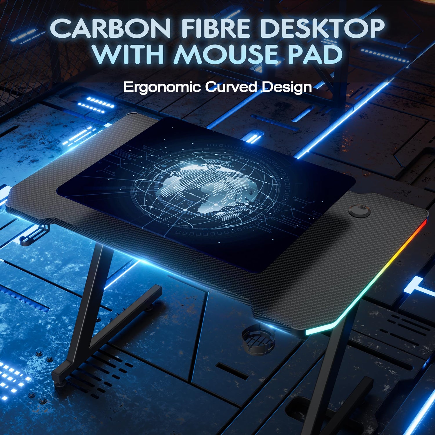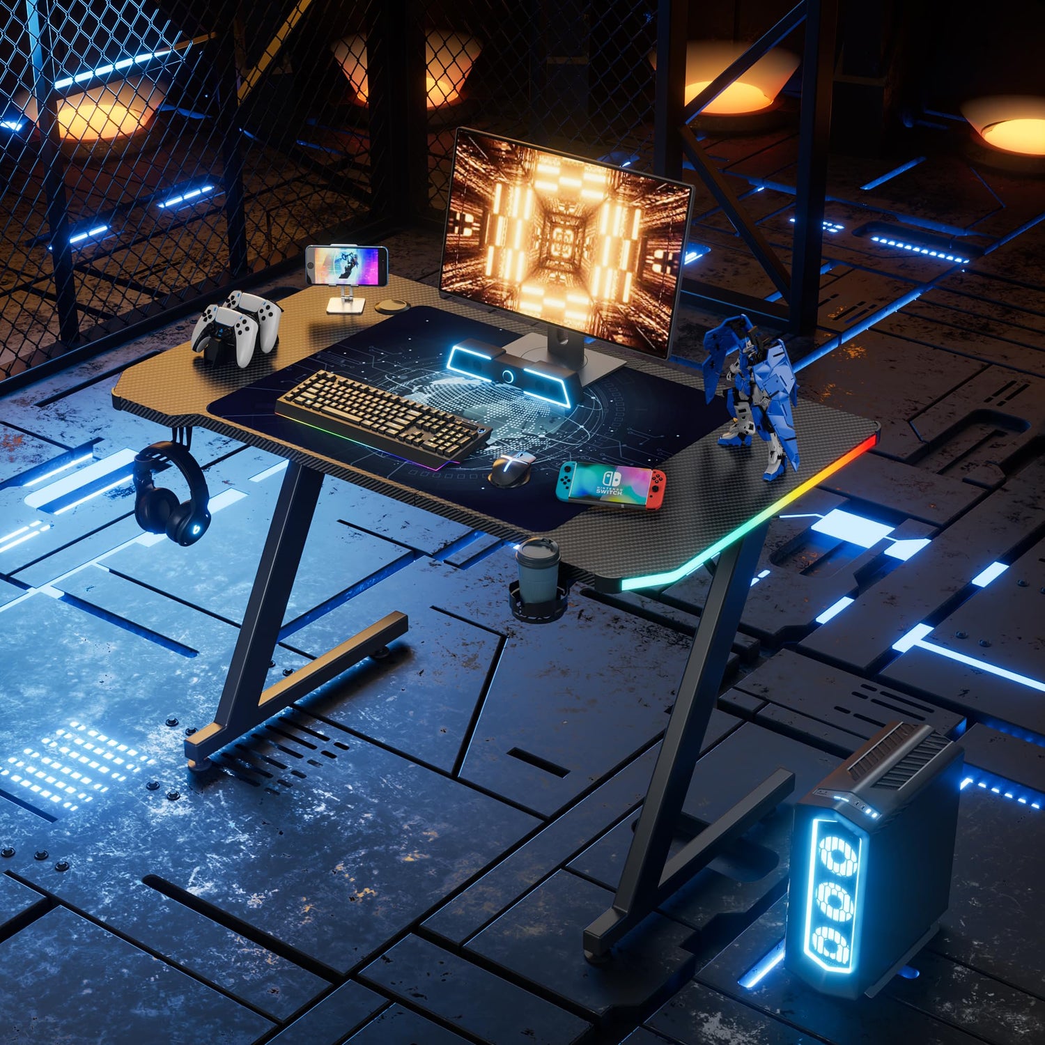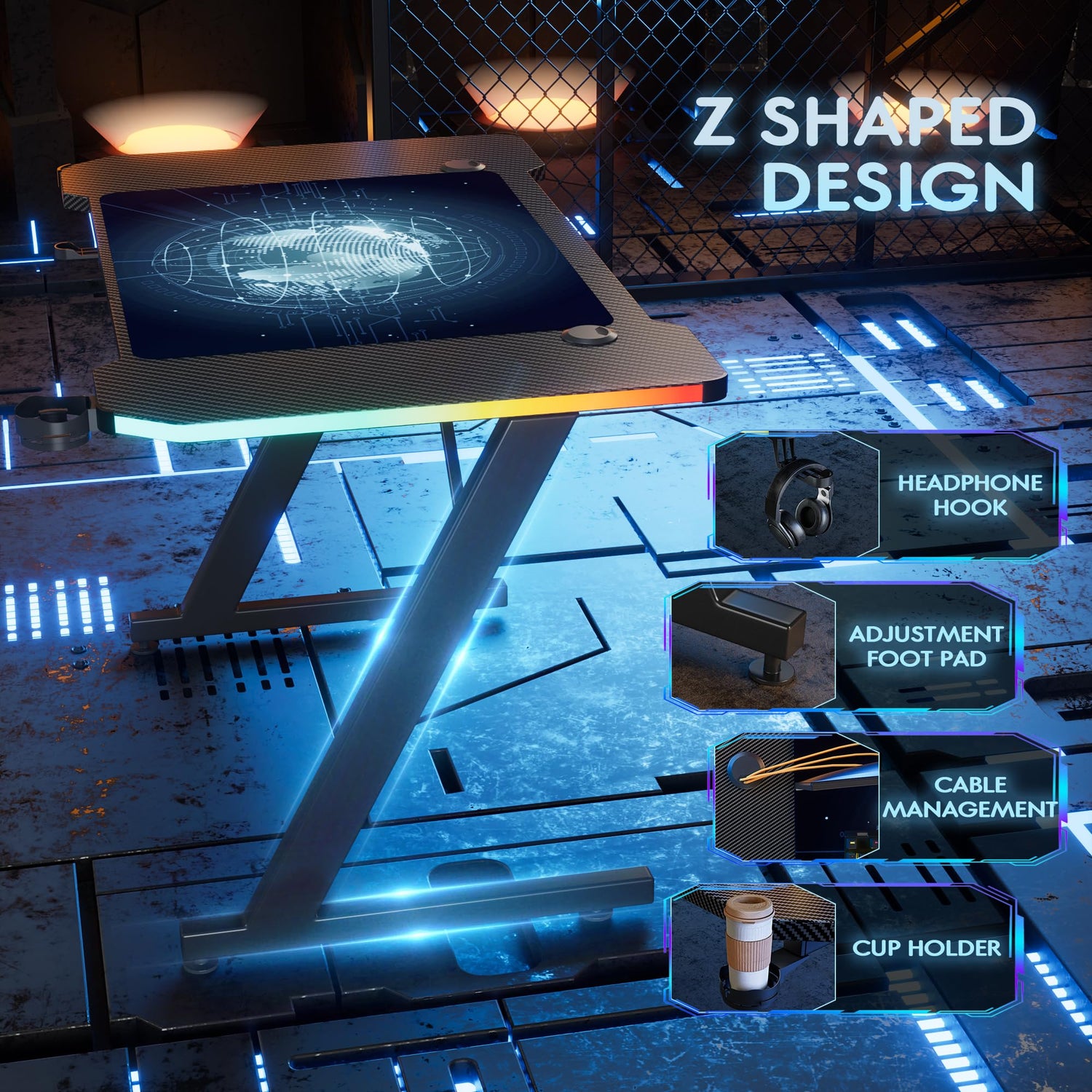 Homall Gaming Computer Desk with Carbon Fiber Surface, Gaming Table Z Shaped PC Home Office with Cup Holder&Headphone Hook(47 in, Black, Led Light)