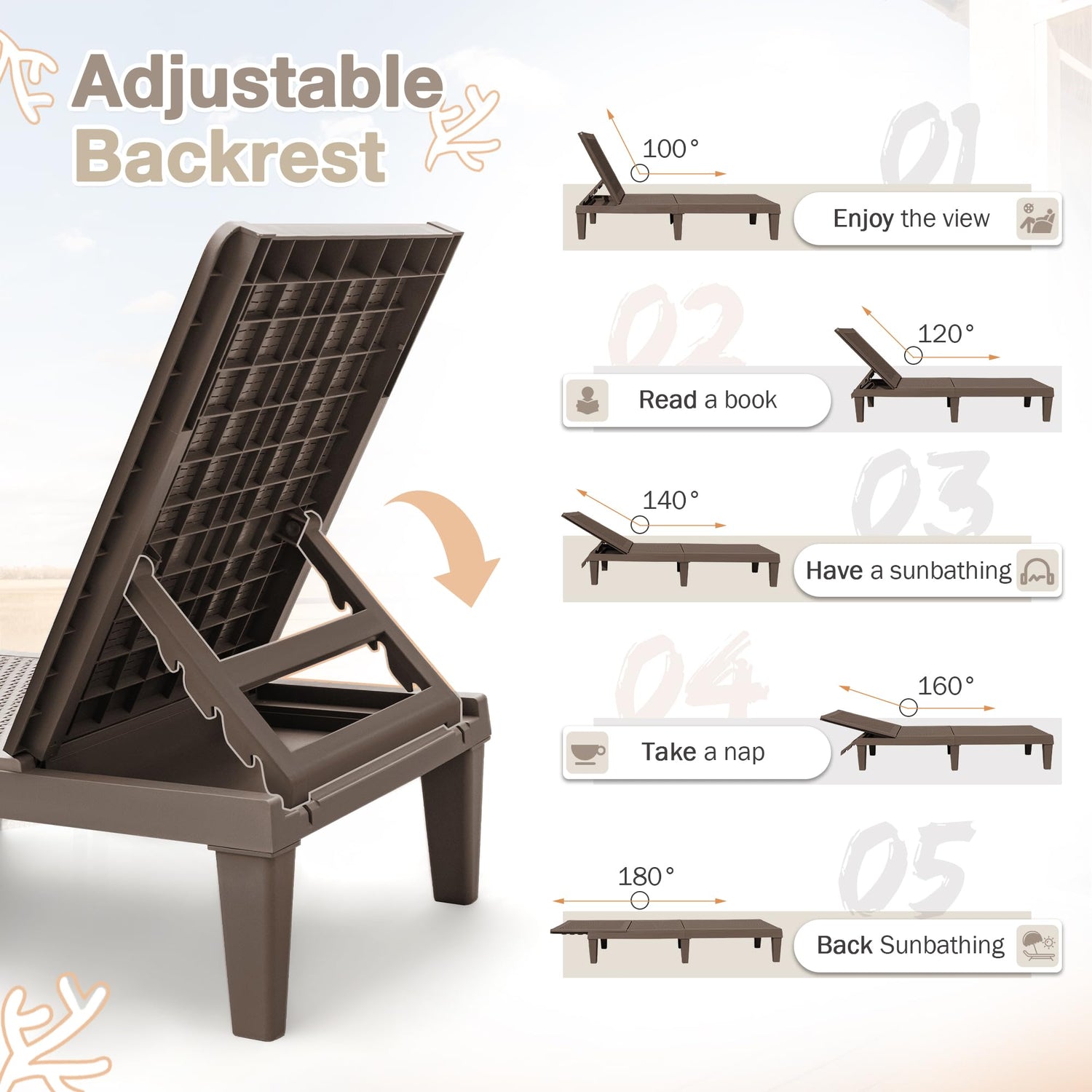 - 【5 Position Adjust】Outdoor chaise lounge backrest has 5 different easy adjustable positions so you can find your comfortable way for napping, reading or spa. Meet all your different needs.