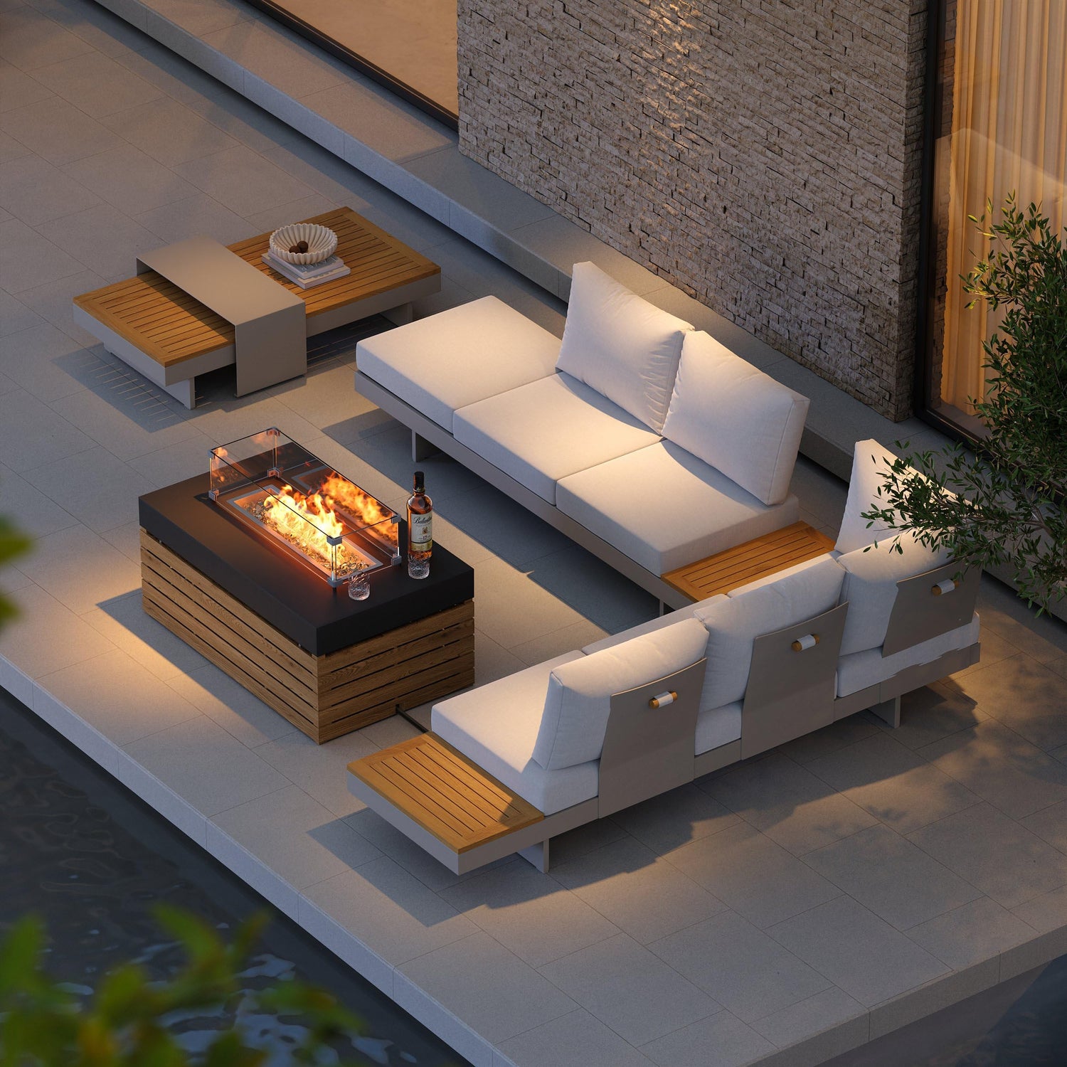 homary 6 Piece Aluminum & Teak Outdoor Sofa Set, Patio Conversation Sets Modular Outdoor Sofa with Fire Pit, Glass Wind Guard Ideal for Patios & Balconies, Light Gray