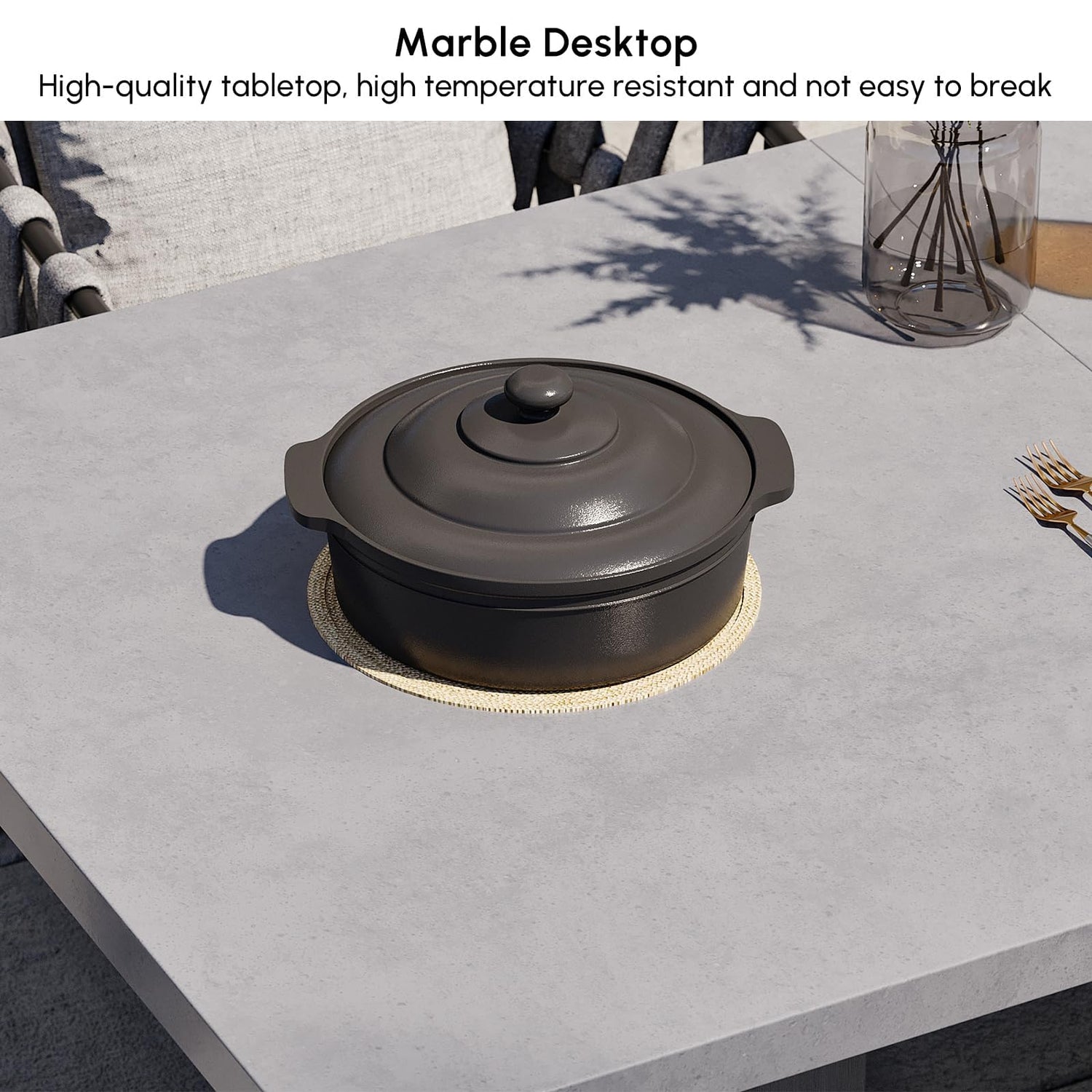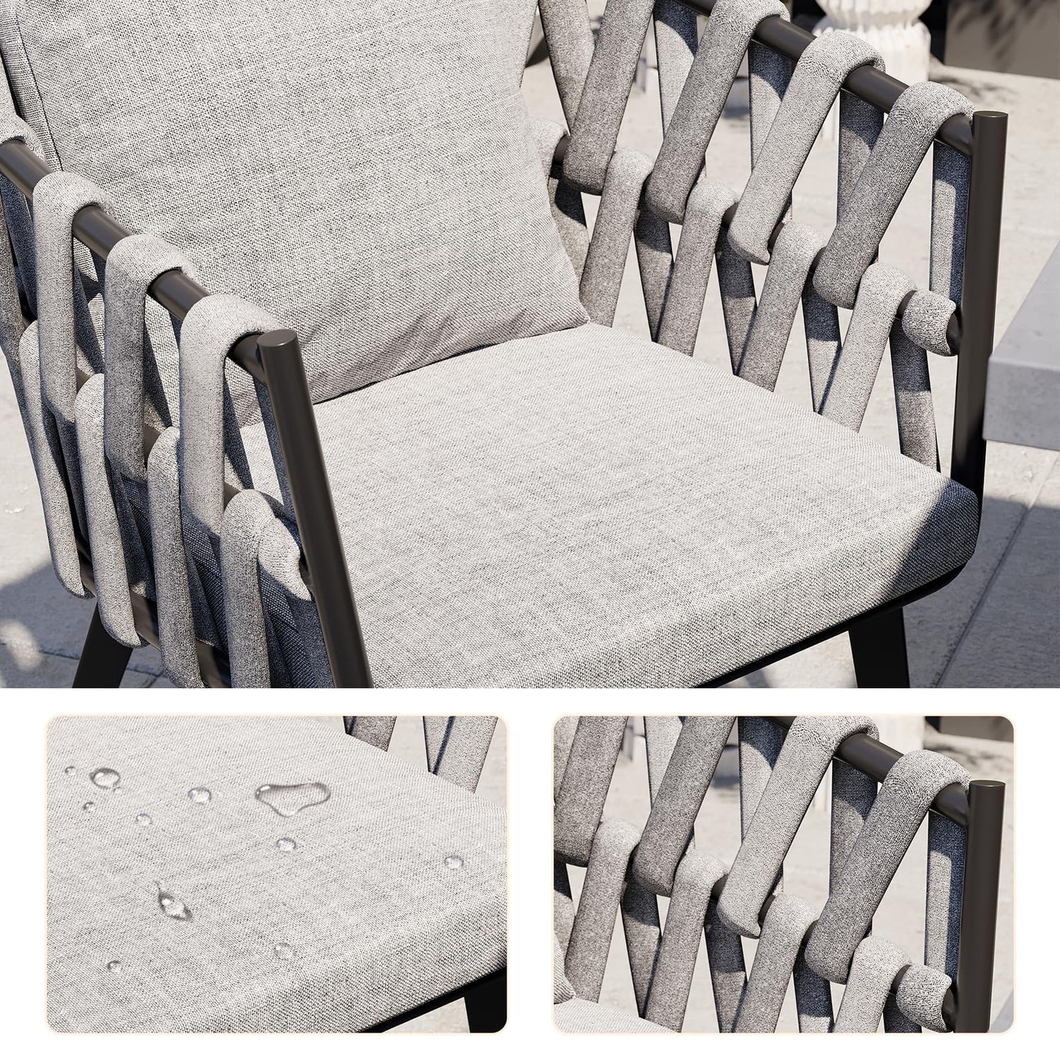 - Premium Gray Aluminum & Woven Design: Crafted from durable aluminum with a cement-colored tabletop and weather-resistant woven rope armchairs, this modern patio dining set is built to withstand outdoor elements