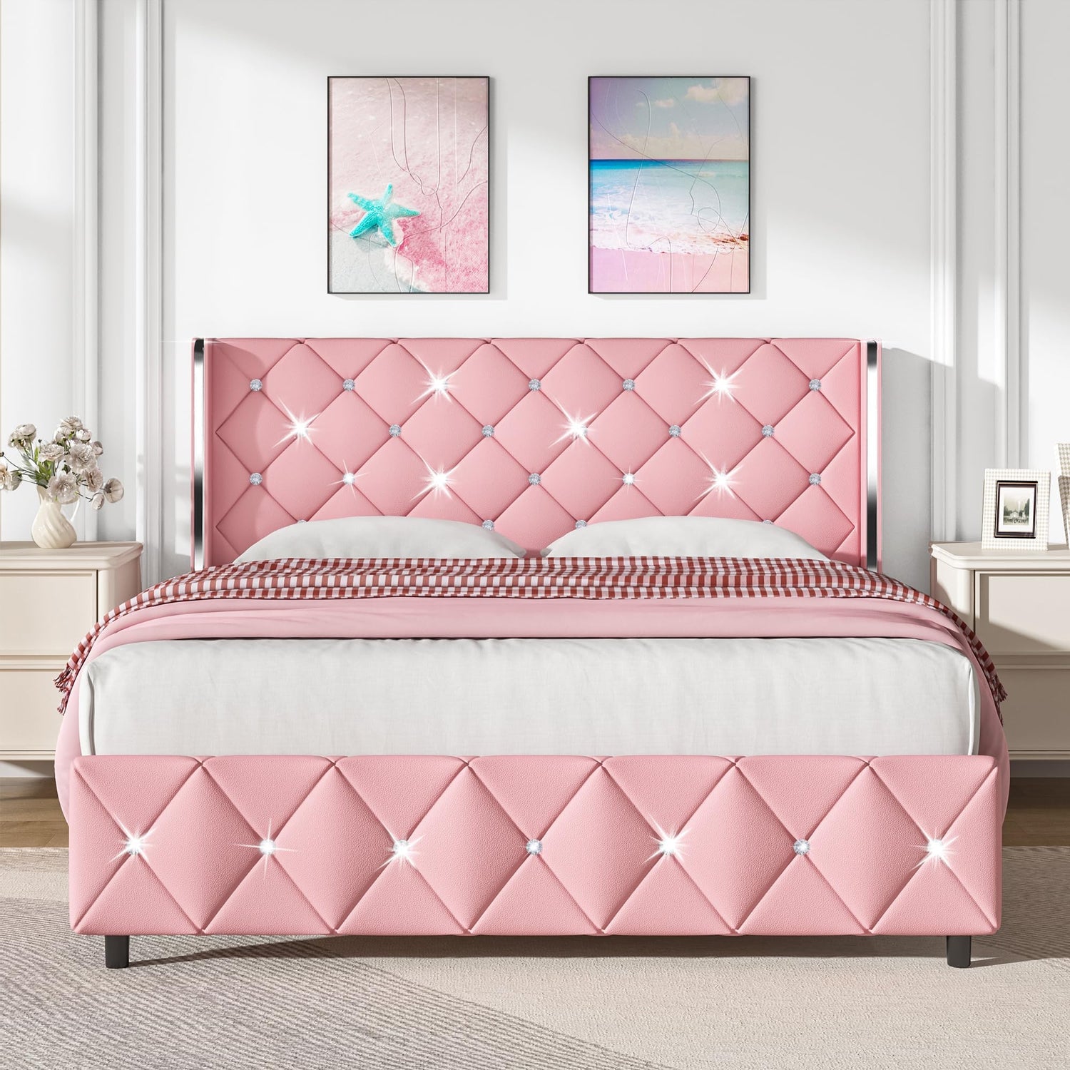 - Adjustable Sparkly Diamond Headboard: Pink upholstered bed frame with PU leather fabric for appearance. The tight surroundings and soft touch fabric ensure your comfort while lying on the diamond headboard bed frames full