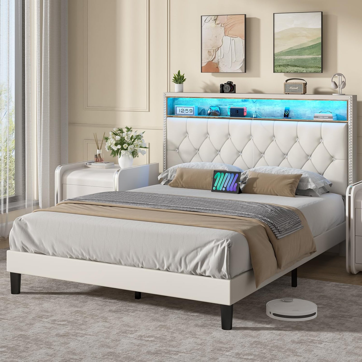 HOMBCK Full Size Bed Frame with LED Lights, Velvet Upholstered Bed with Charging Station and Storage Headboard, Modern Bed Frame with Diamond Design, No Box Spring Needed, Easy Assembly, White