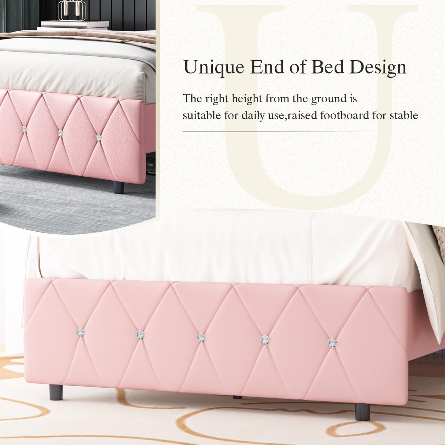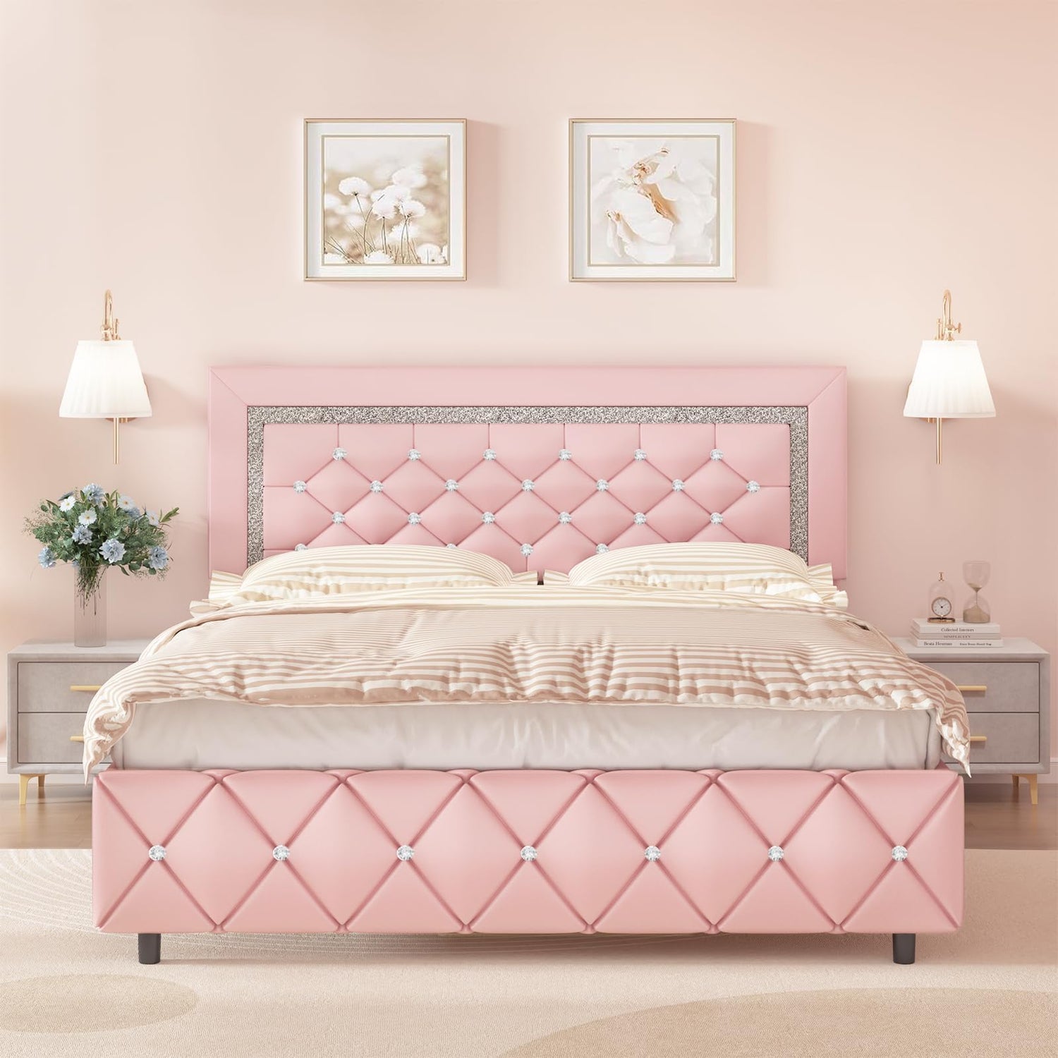 - Adjustable Diamond Headboard: We offer an adjustable headboard for this pink queen bed frame to fit different mattress heights. The sparkling diamonds will surround you