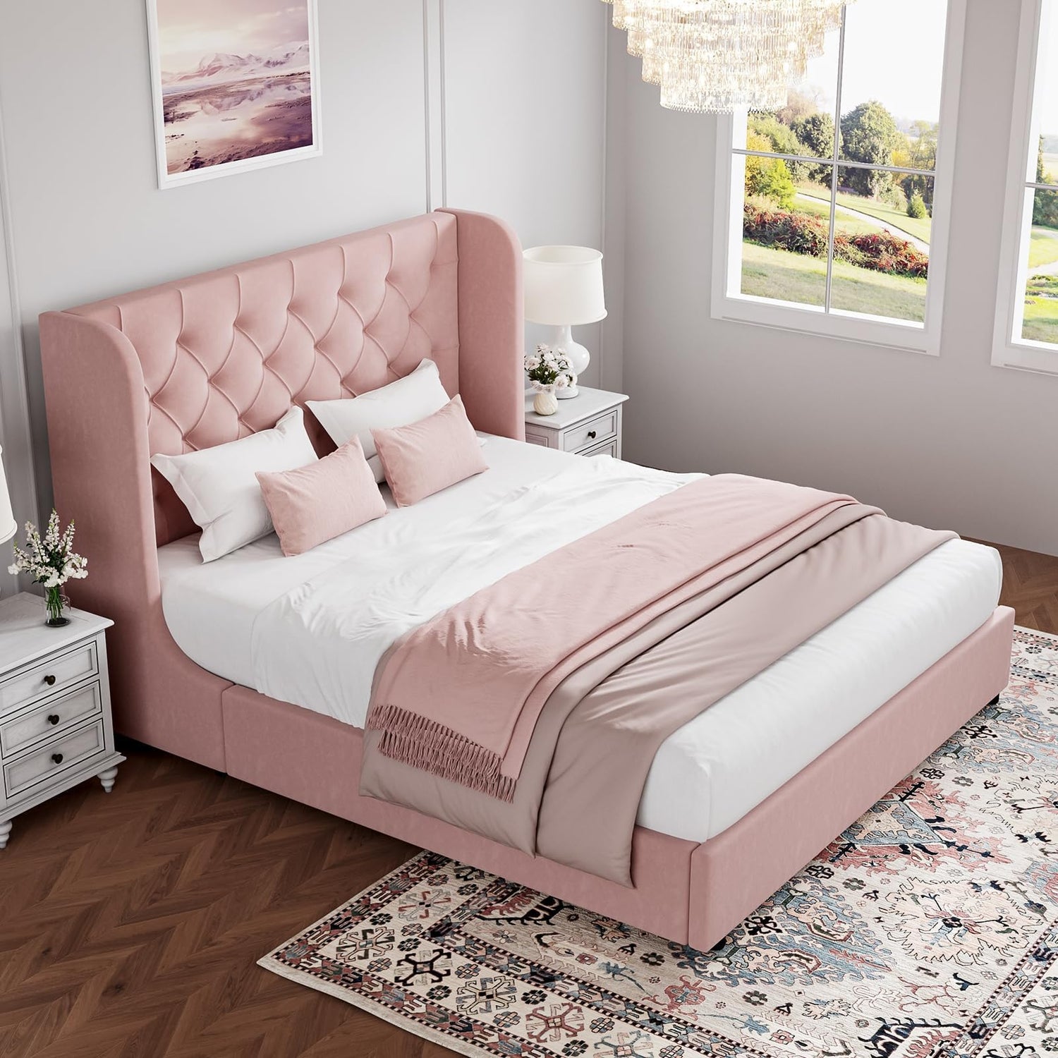 HOMBCK Queen Bed Frame, Upholstered Bed Frame with Headboard, Pink Queen Bed Frame, Wide Wingback, Soft Velvet Bed Frame, No Box Spring Needed, Noise Free, Easy Assembly, Pink