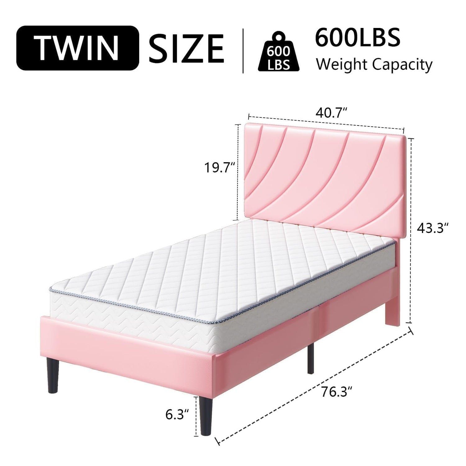 HOMBCK Twin Bed Frames/Faux Leather Upholstered Platform Bed with Headboard/Strong Wooden Slats/No Box Spring Needed/Easy Assembly/Pink