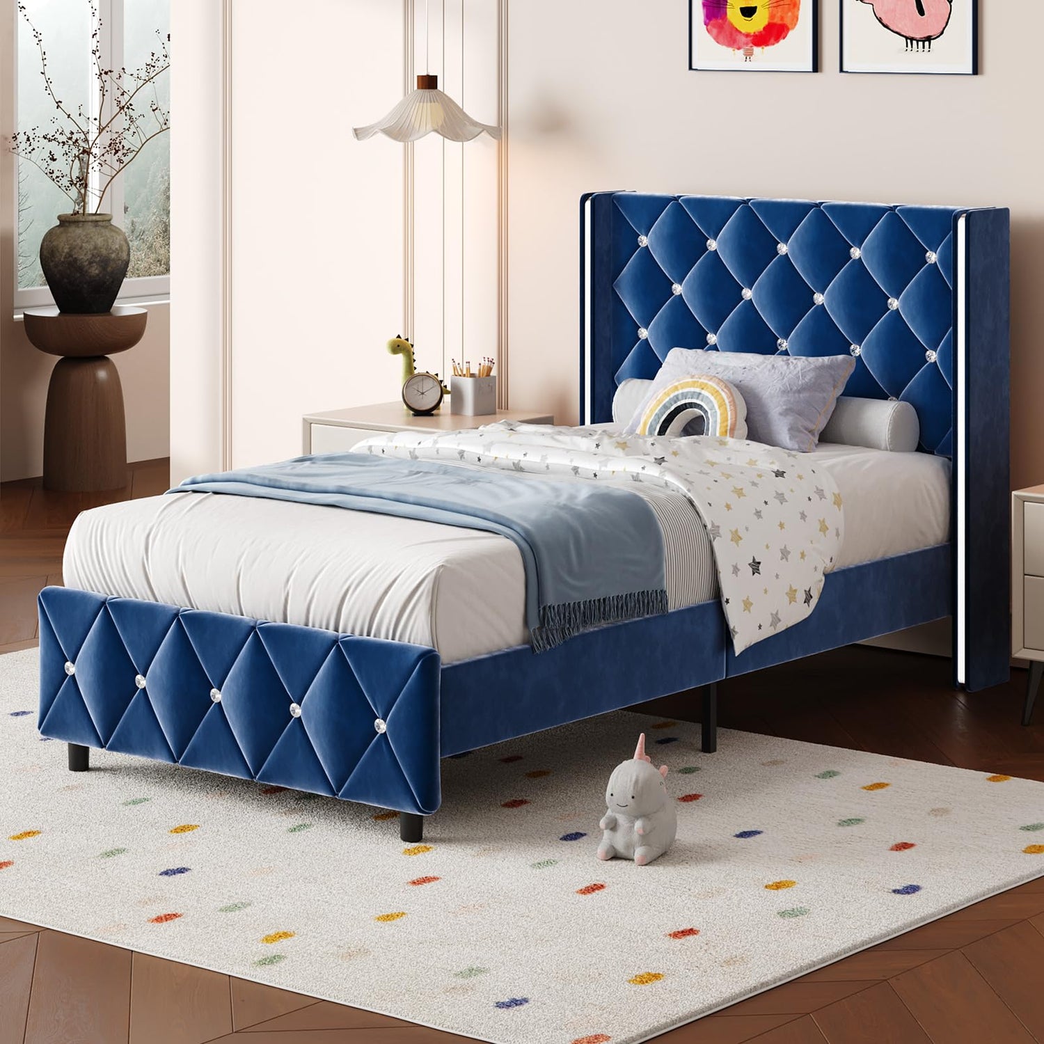 HOMBCK Twin Bed Frames, Upholstered Platform Bed with Diamond Tufted Headboard, Modern Velvet Bed Frame with Wingback Design, No Box Spring Needed, Easy Assembly, Blue