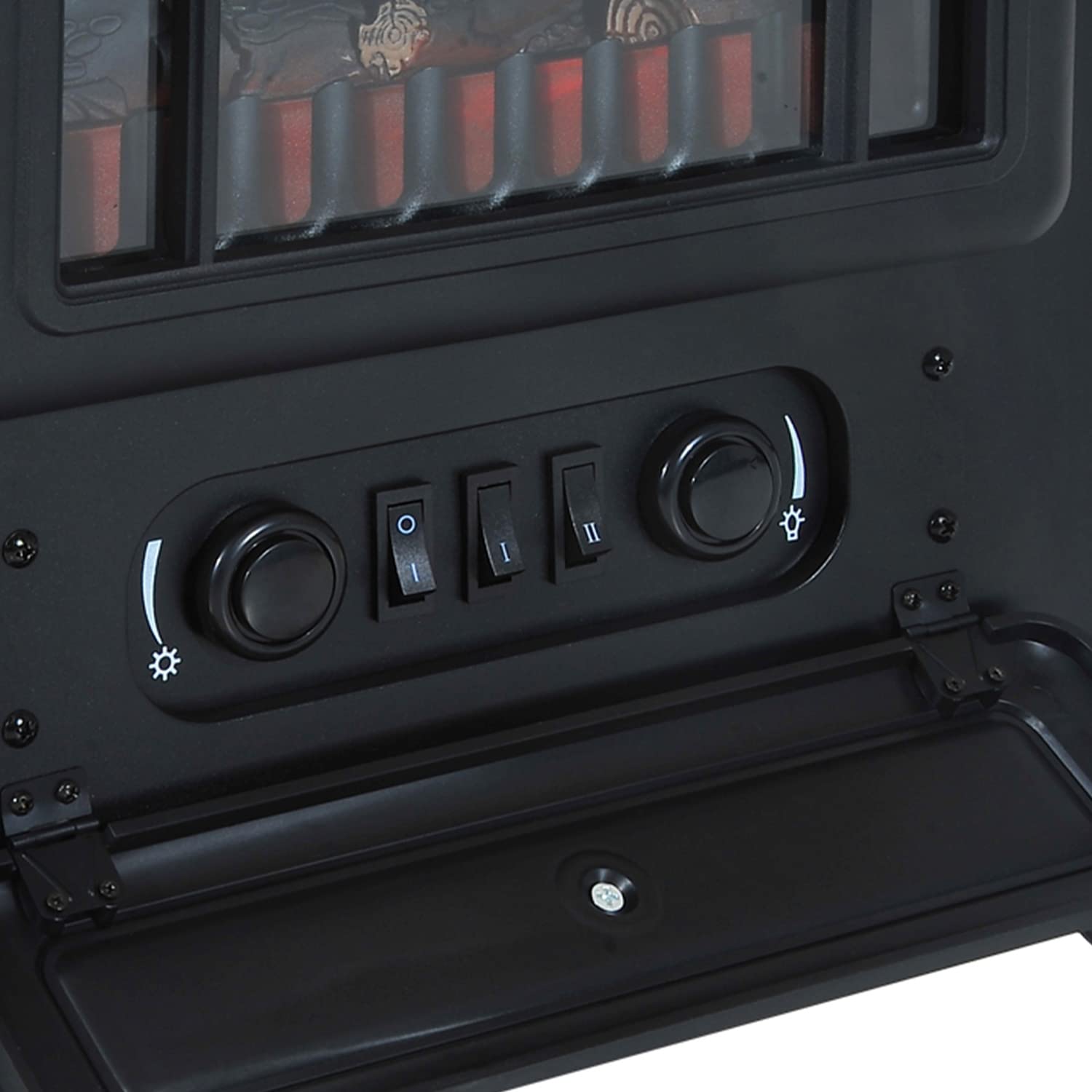 Details: Discover the beauty and convenience of a HomCom free standing electric heater fireplace and enjoy warmth and comfort without all the work of a traditional unit. Enjoy the benefits of a wood stove without the dangers of a real fire with this HomCom electric wood stove space heater. The realistic flame effect looks like a real fireplace, and with adjustable brightness and heat settings, you can create the perfect fire for any occasion. Featuring 2 adjustable heat settings, an automatic shut off timer, adjustable brightness, and flame sans heat setting, this heater is both functional as well as stylish. The compact size allows for this heater to be moved easily, and is perfect for supplemental heating in an office, den, tiny house or motor home.