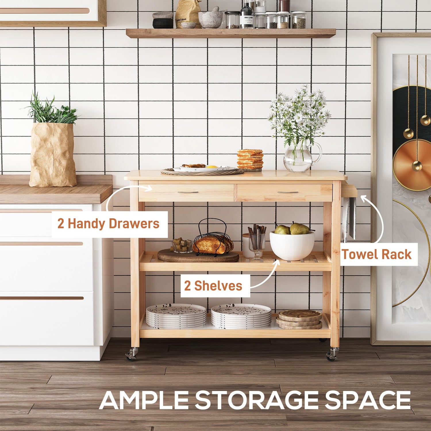 HOMCOM 42" Kitchen Trolley Cart Rolling Island, Wooden Utility Serving Cart with 2 Drawers and 3-Tier Shelf, Natural