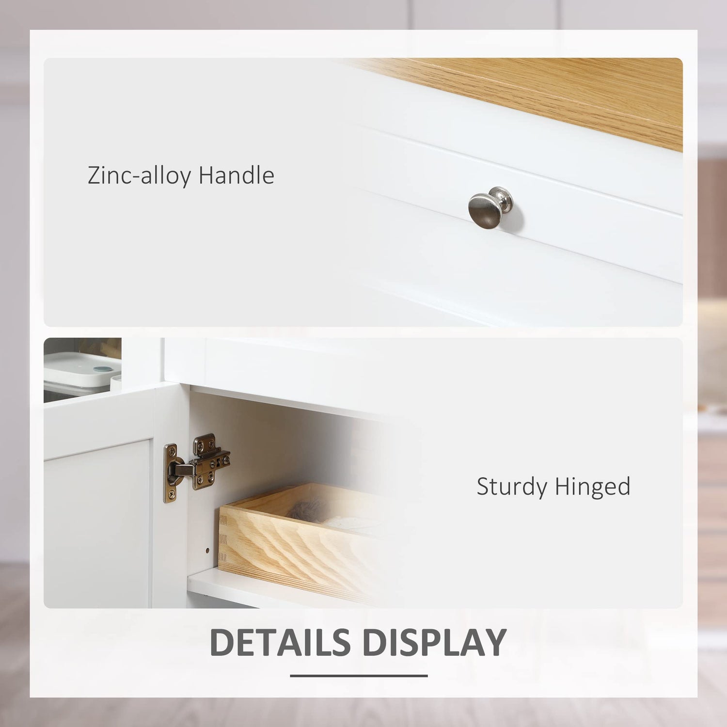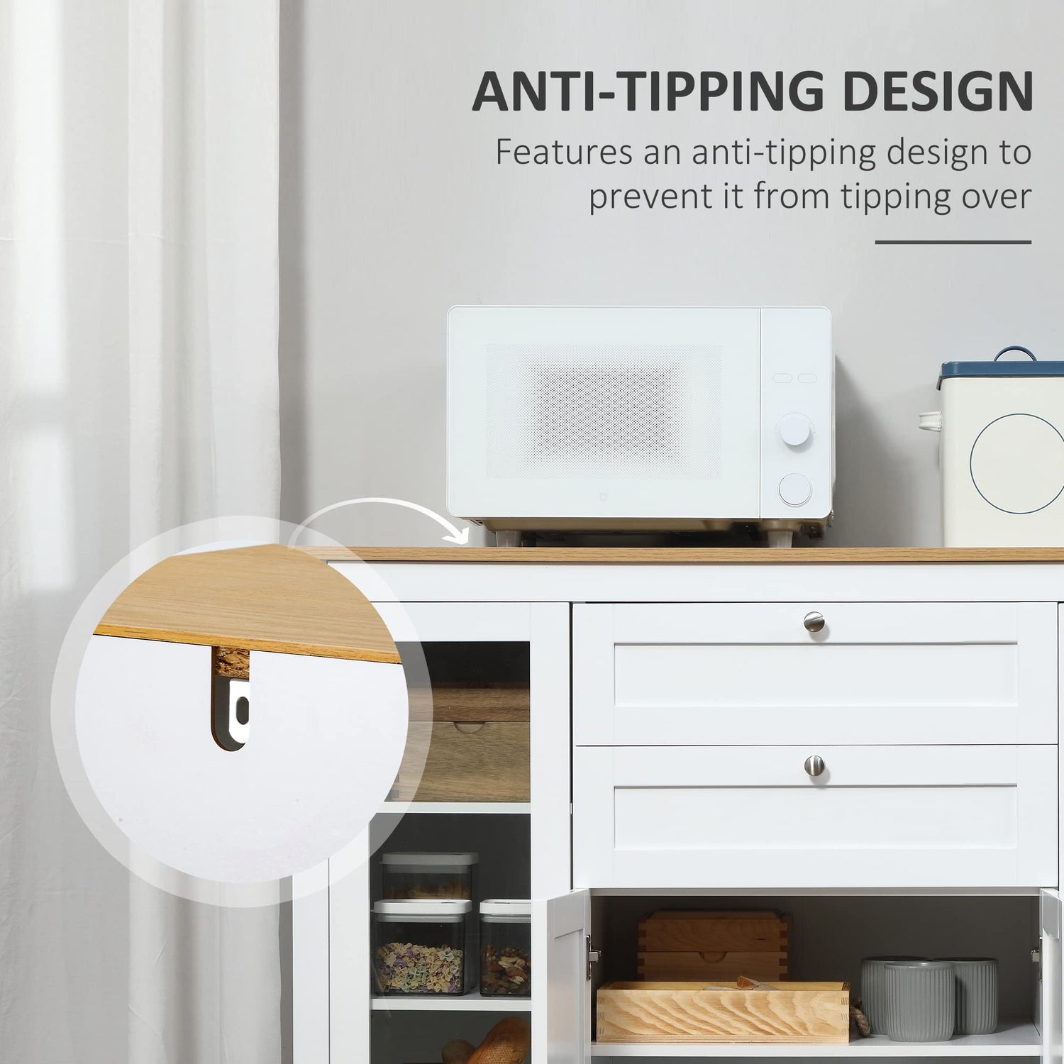 - Quality is Priority: Made of MDF, rubber wood, and tempered glass, the kitchen buffet is stable and sturdy. An anti-toppling design prevents the buffet sideboard from tipping over.