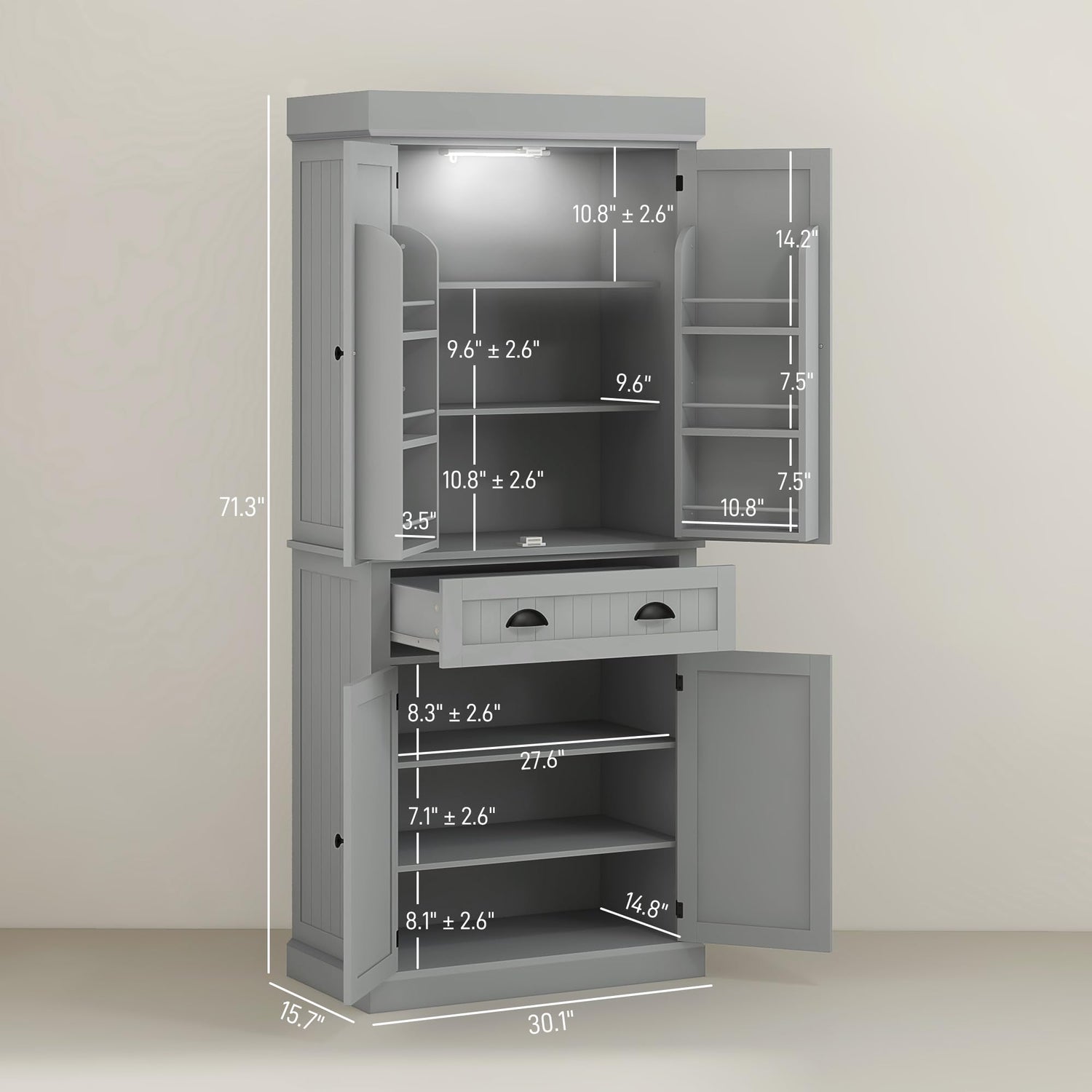 HOMCOM 71" Kitchen Pantry Cabinet with LED Motion Sensor Light, Tall Storage Cabinet with 6 Door Shelves, Drawer & Adjustable Shelves, for Living & Dining Room, Gray
