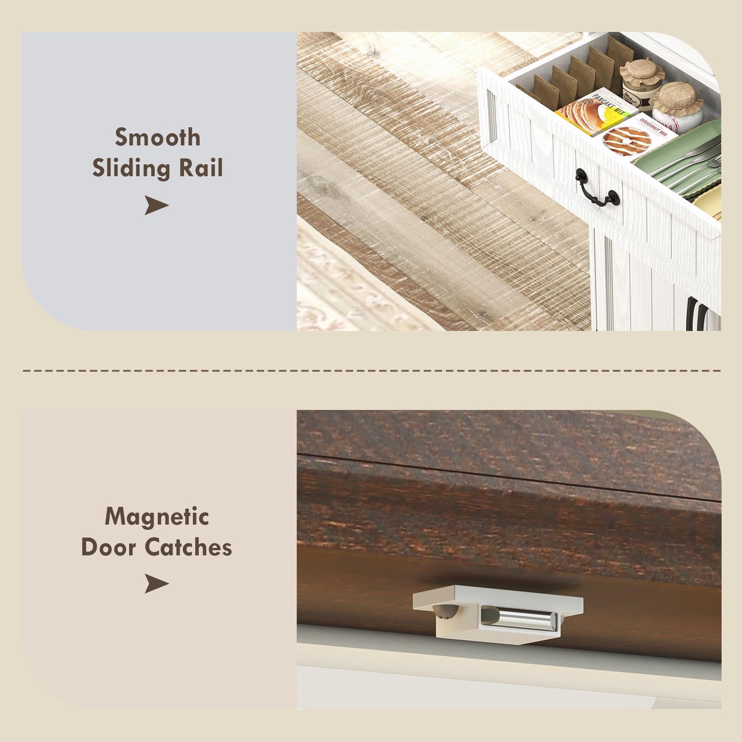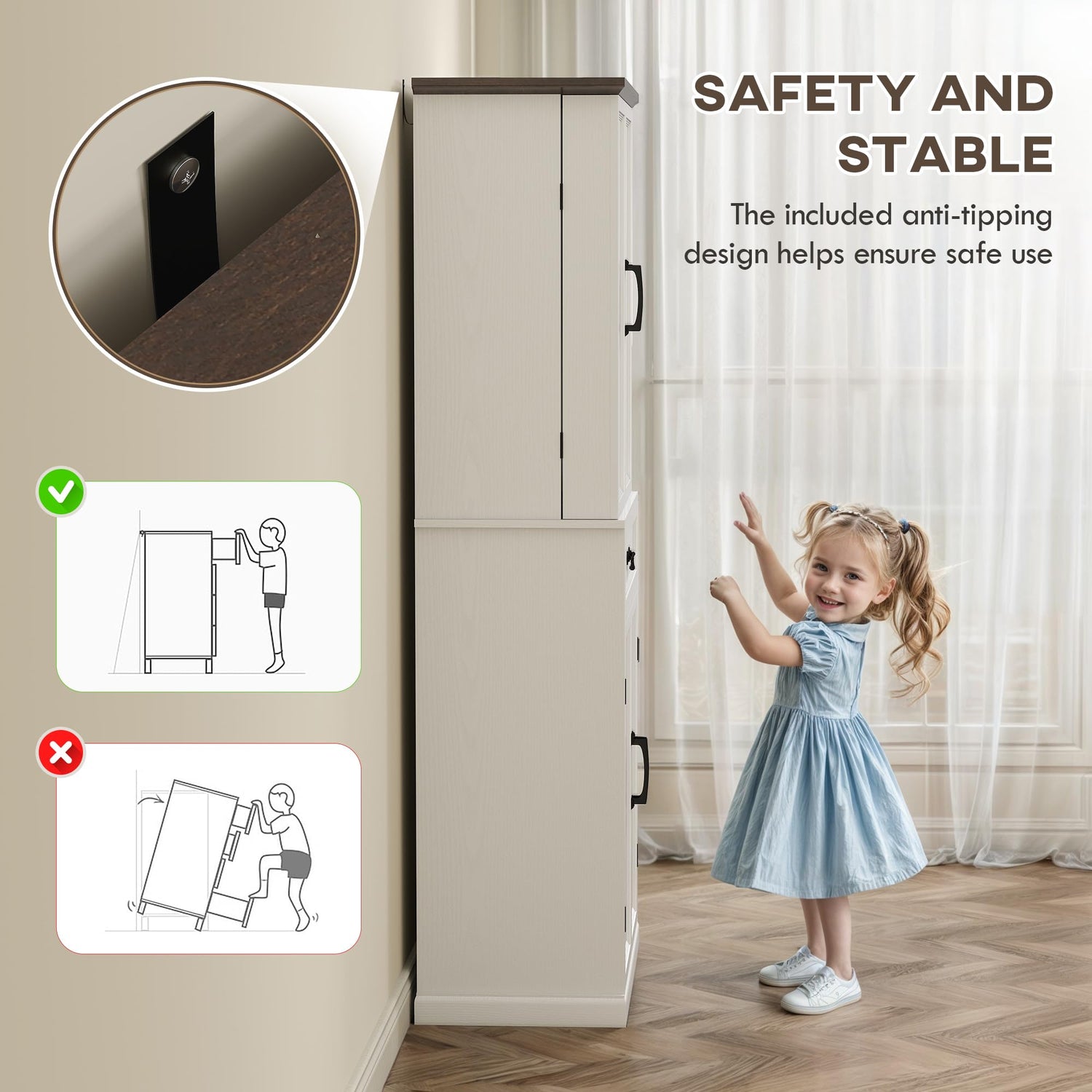 - Solid, Stable, and Secure: Crafted from quality particle board and MDF, this reliable kitchen cabinet features an anti-tip kit for added safety. With eight robust hinges on the magnetic doors, you can safely enjoy smooth and worry-free use every day