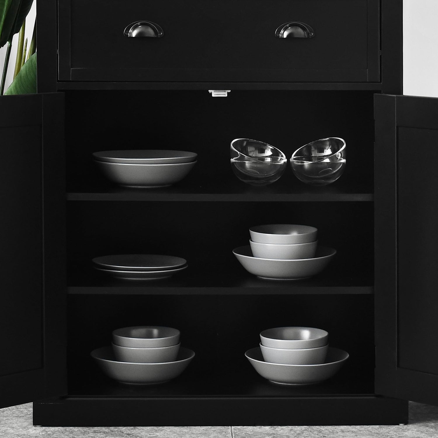 - Ample Space: The freestanding pantry has large space with a deep, easy-gliding drawer and two large cabinets with magnetic closure doors, making it suitable for storing various household items such as silverware, knick-knacks, towels, cookware, etc.