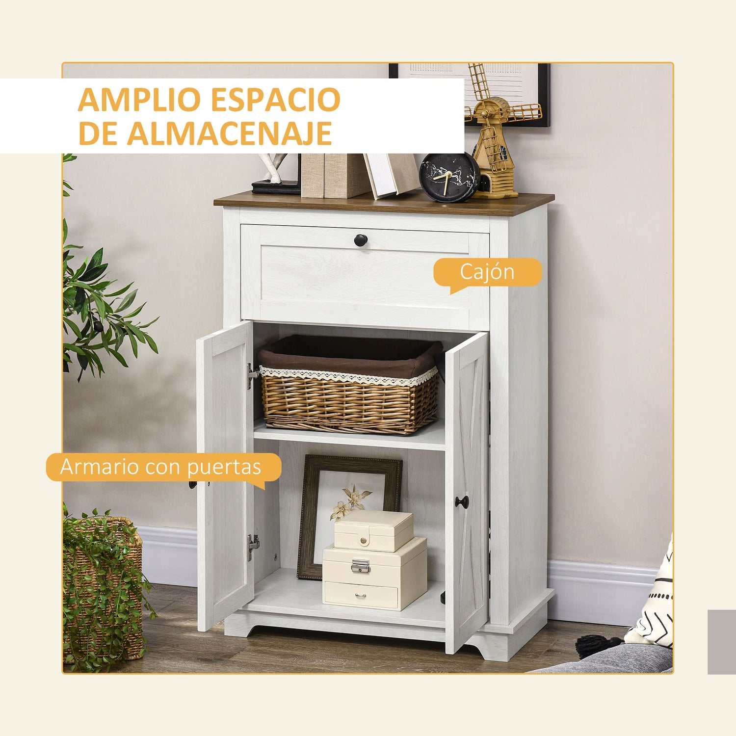 - Ample Storage: With a large tabletop, a drawer, and a two-tier doored cupboard, this storage cabinet offers plenty of room for what you want - tableware, glasses, books, or plants. The shelf inside the cabinet is adjustable to meet your different storage needs.
