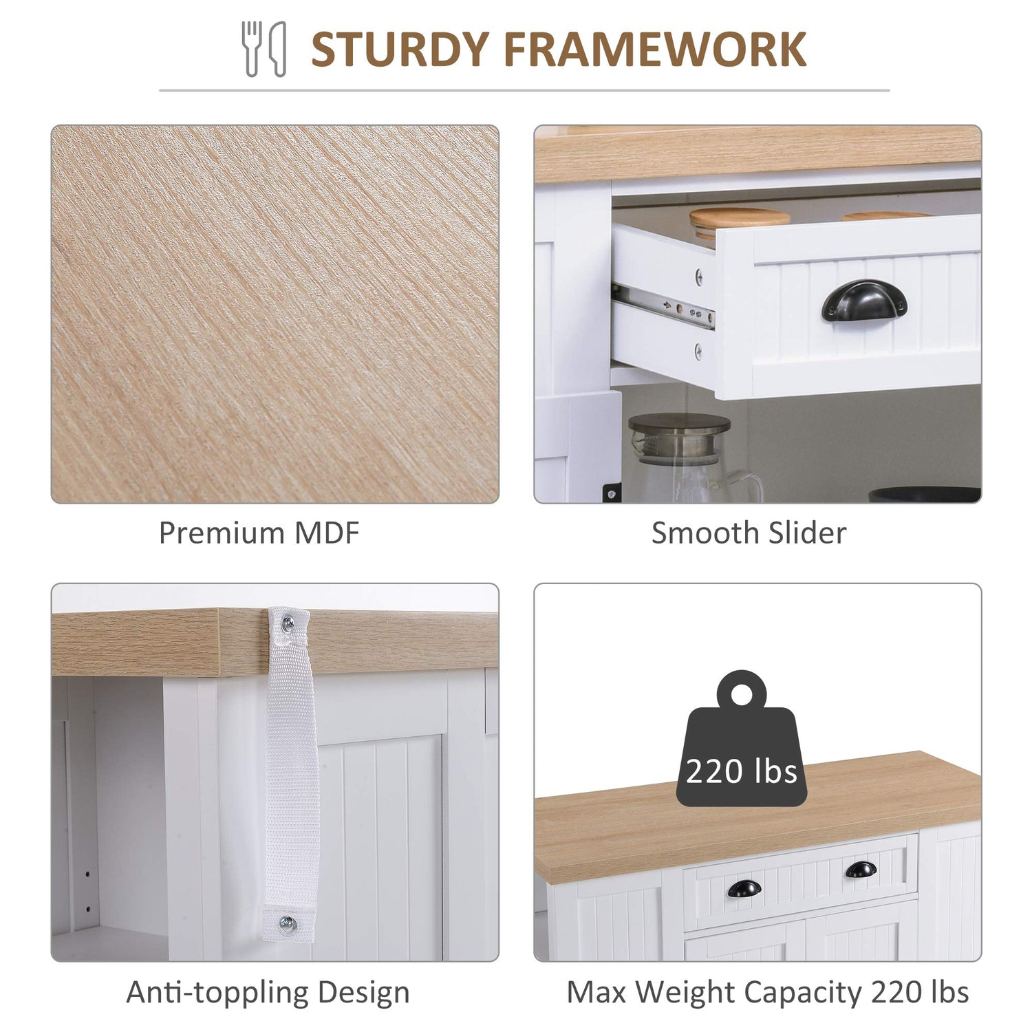- Multiple Storage Options: The kitchen island with storage features a large drawer for storing utensils, while the two cabinet doors house interior shelves for larger kitchen necessities. Open storage areas on the sides with adjustable design provide additional space.