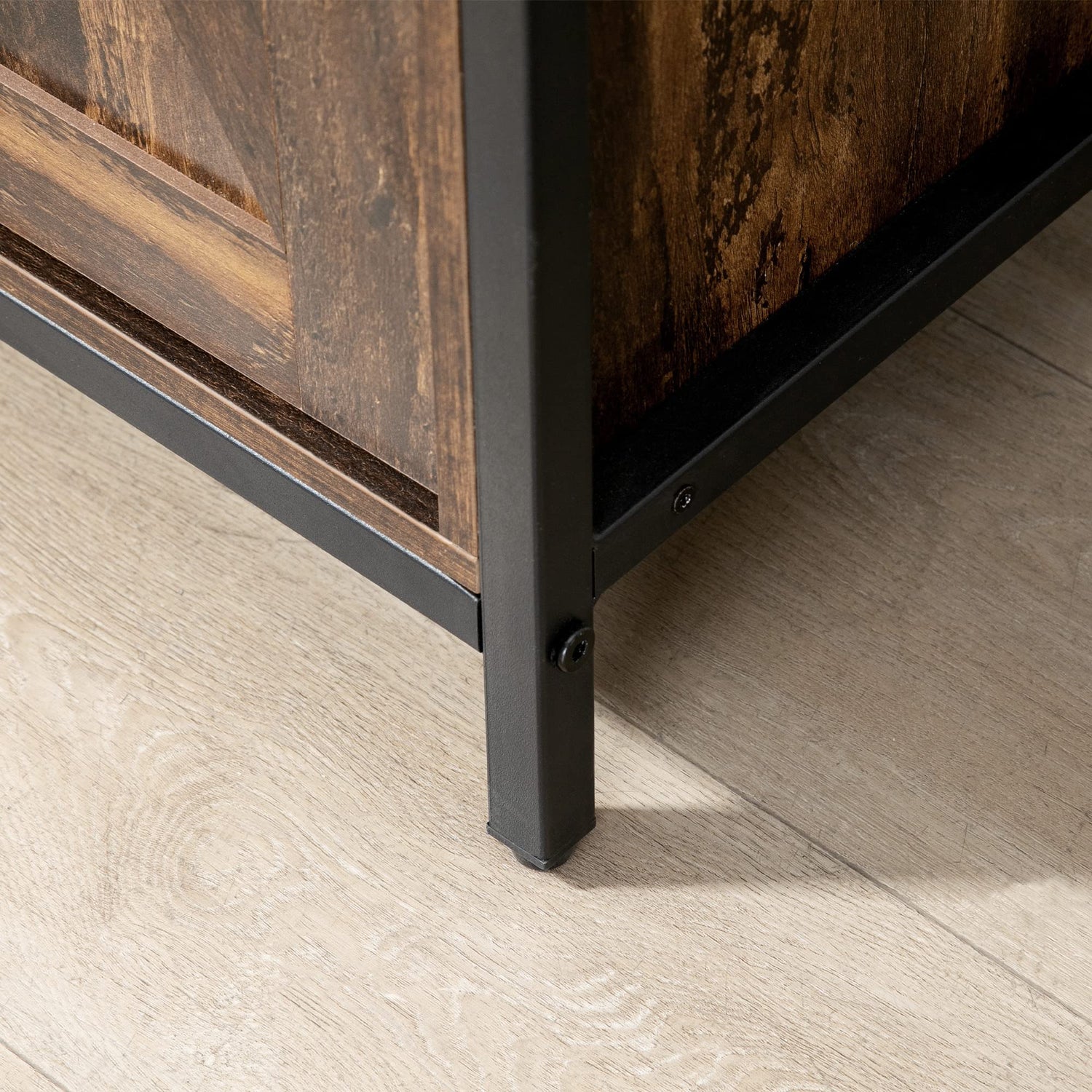 - Industrial Style: A chic and farmhouse style, this is a design you'll love. Sleek steel marries rustic textures to create the perfect play of contrasts. The console table comes with sliding barn doors to provide access to the storage cabinet's sides.