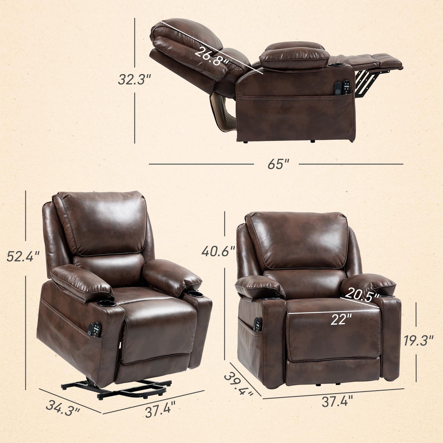 HOMCOM Power Lift Recliner Chair Sofa with Vibration Massage and Heat, Faux Leather Wide Lift Chair for Elderly, Overstuffed Reclining Chair with Remote Control, USB Port and Side Pockets, Brown