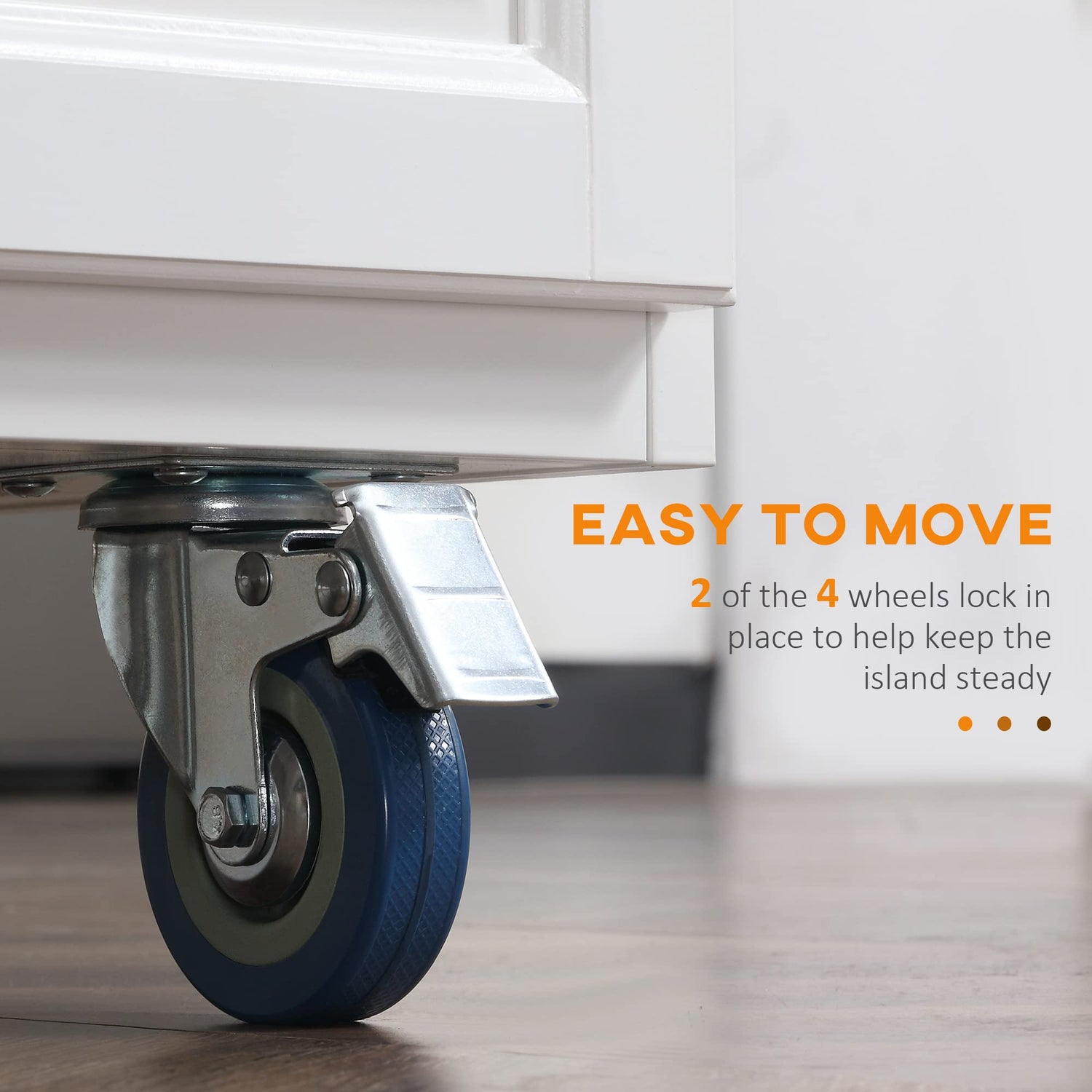 - Easy to Move Around: The rolling design on wheels lets you quickly move the island table around the kitchen or your home. Two of the four wheels lock in place to help keep the island steady.