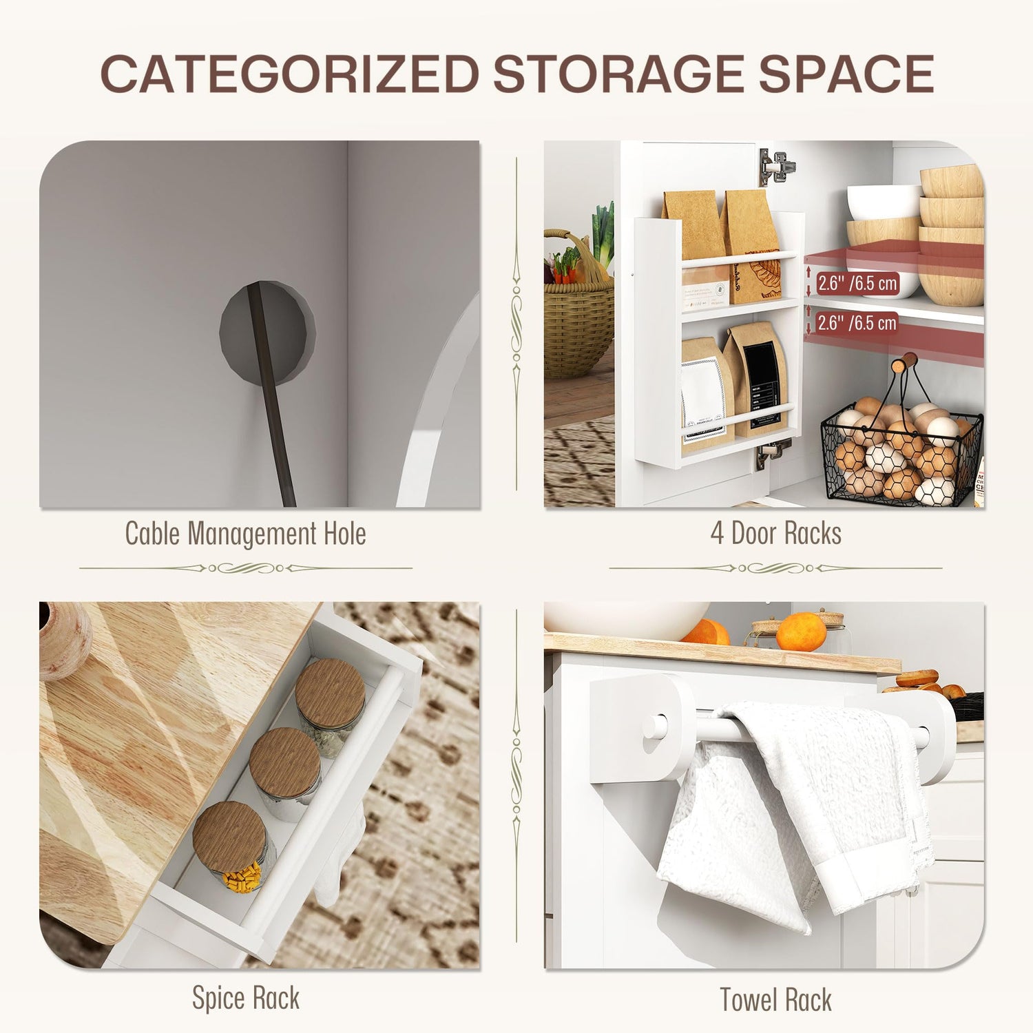 - Categorized Storage: The kitchen island cart boasts three drawers, two cabinets, and four-door racks for kitchen essentials. An adjustable shelf in a double-door cabinet provides flexibility, while a towel rack and spice rack keep your workspace tidy